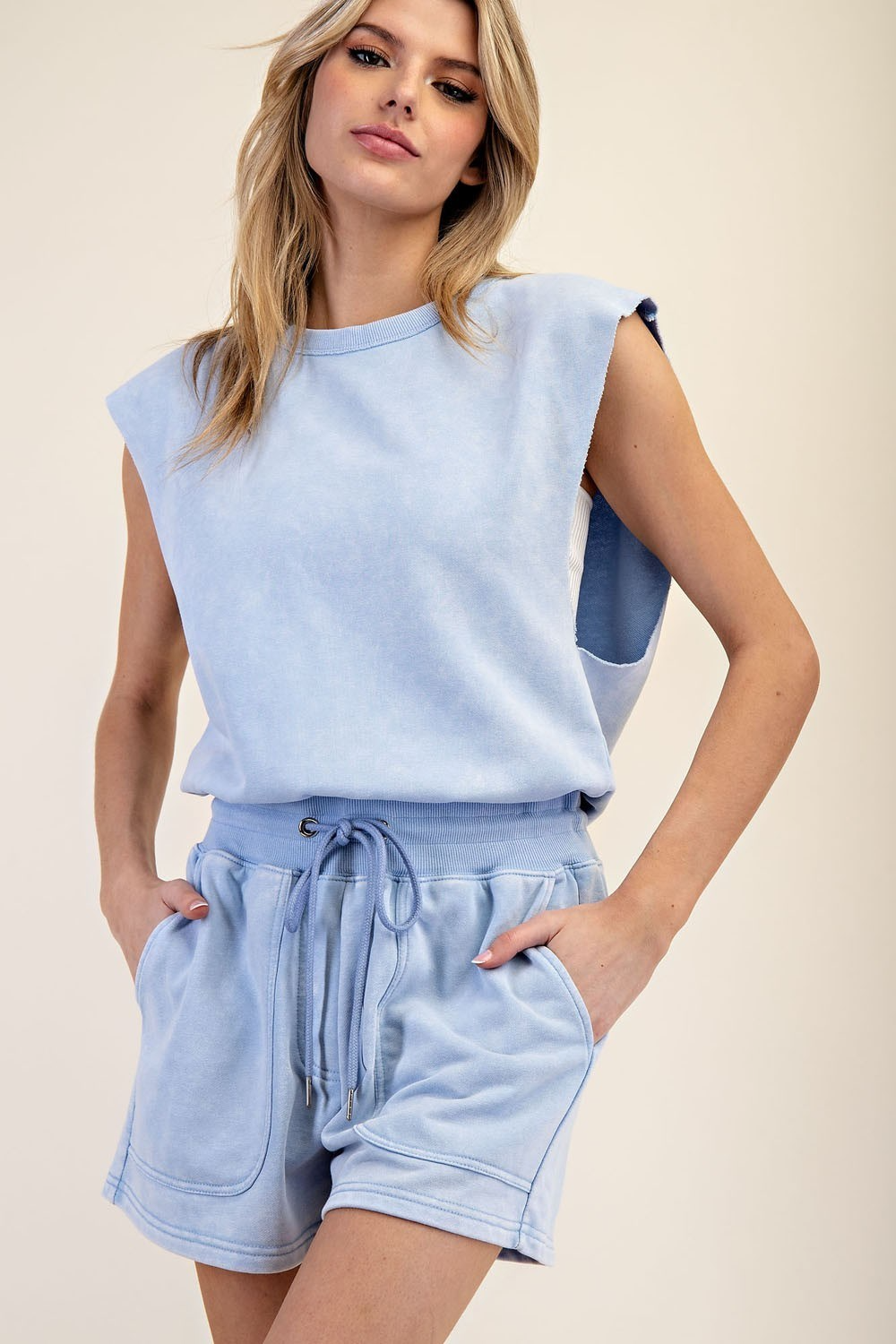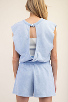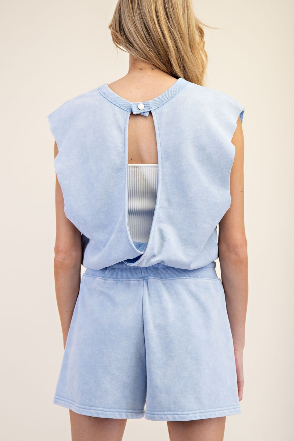 Mineral washed short sleeve romper featuring a rounded neckline, cap sleeves, a button closure in the back creating a large keyhole, an elastic waist with a pull drawstring, two side hip pockets and is a relaxed silhouette.