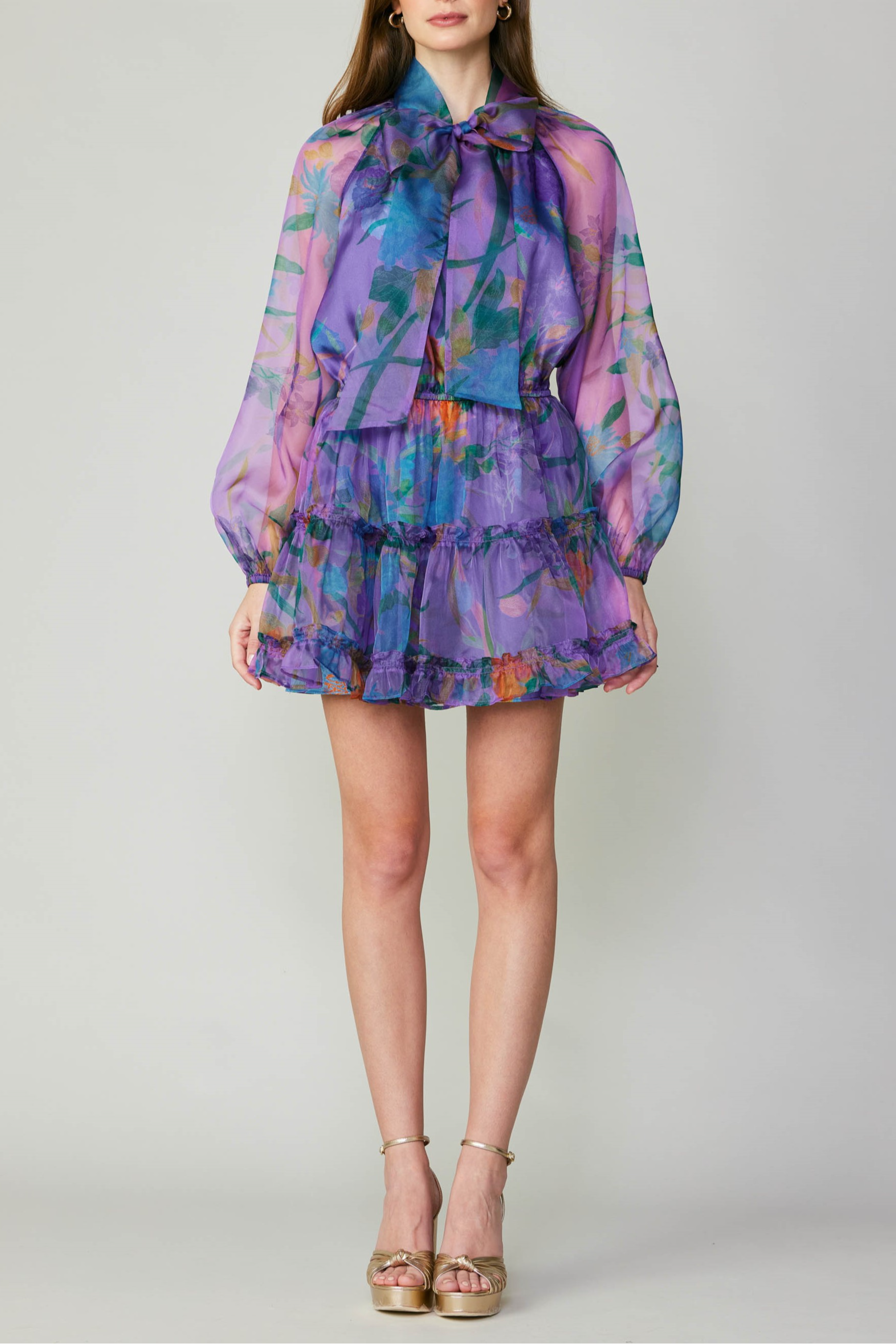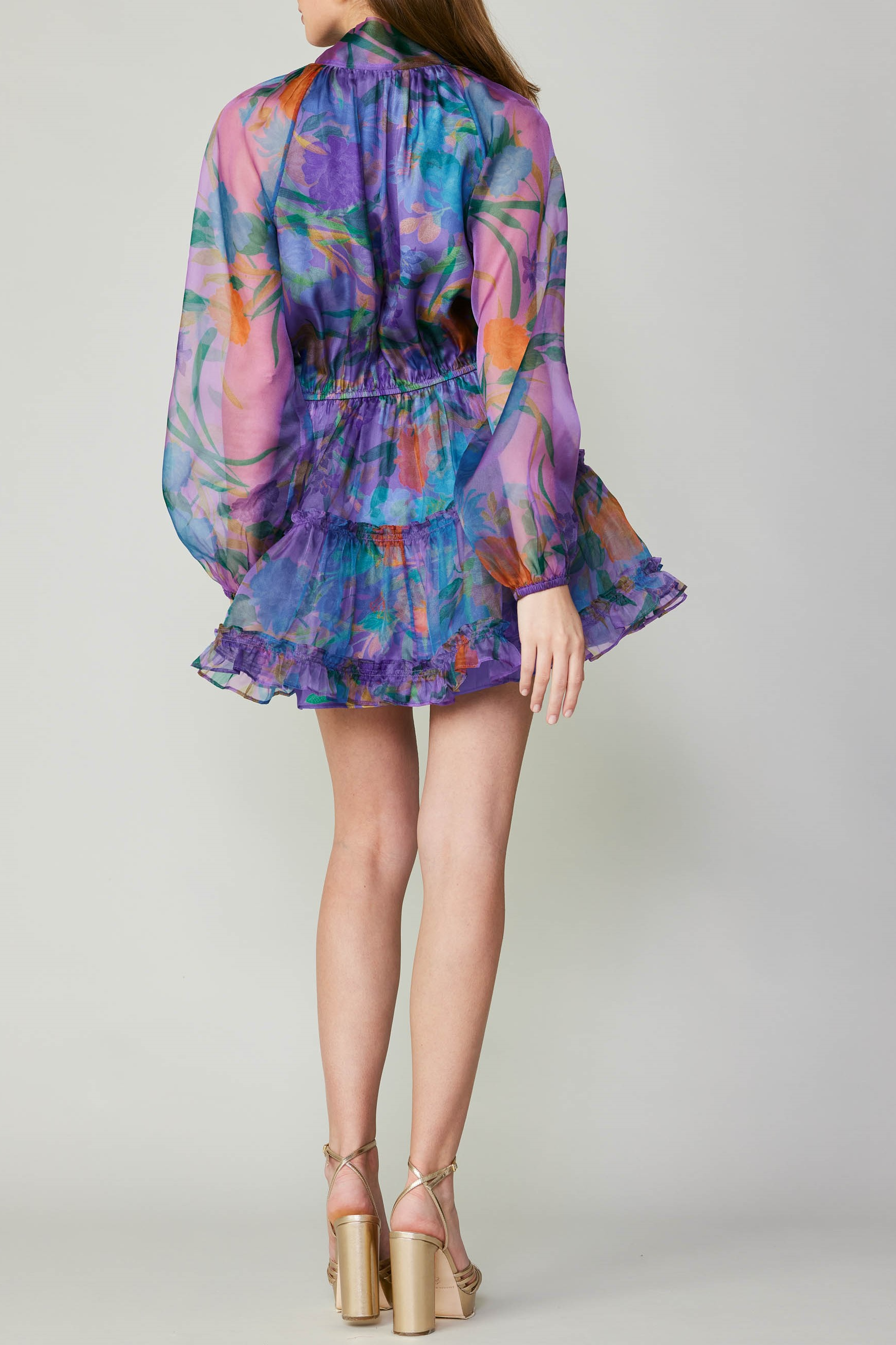 Embrace your quirky style in this mini tiered dress. This dress has a sheer floral printed overlay, along with a chic necktie to complete the look.