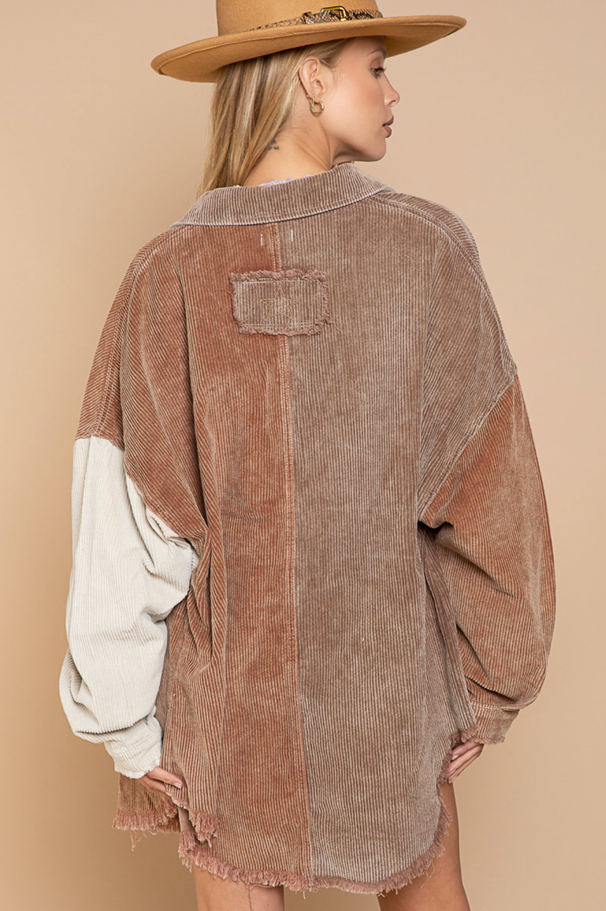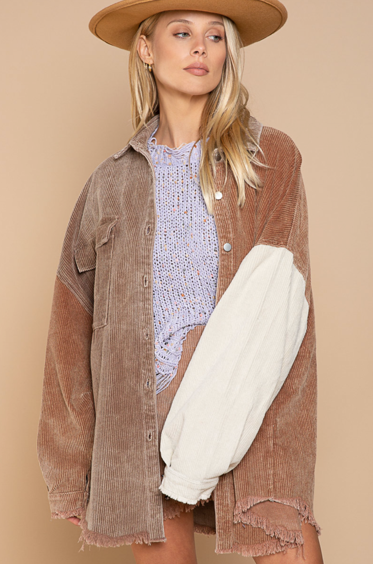Designed in color mix-match jacket with button closure, balloon sleeve with contrast color panel, relaxed fit with raw hem edge, chest pocket, small patch on back.