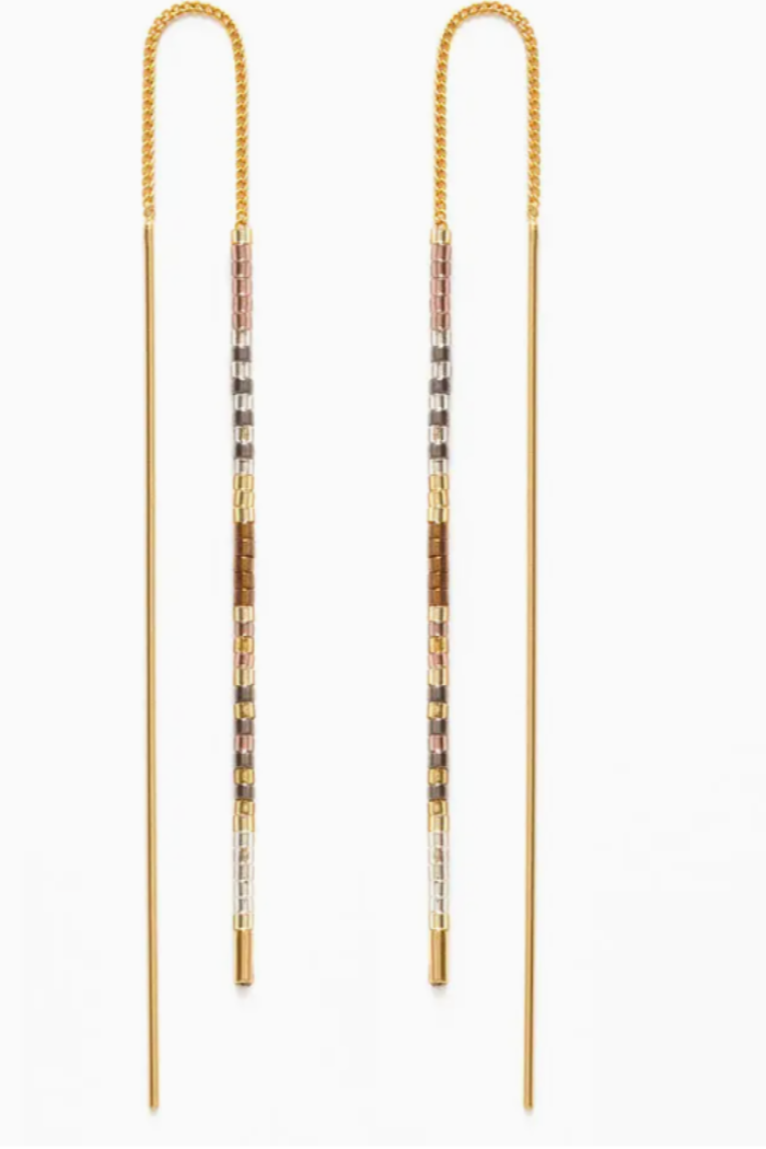 We are very excited about these new earrings! They combine our best selling threaders with our best selling Miyuki seed bead earrings. They hang 3.25" so they are swishy and sexy. Great for summer, and elegant enough for a dressy night out. Made with genuine Japaese Miyuki beads and 14k gold plated brass.