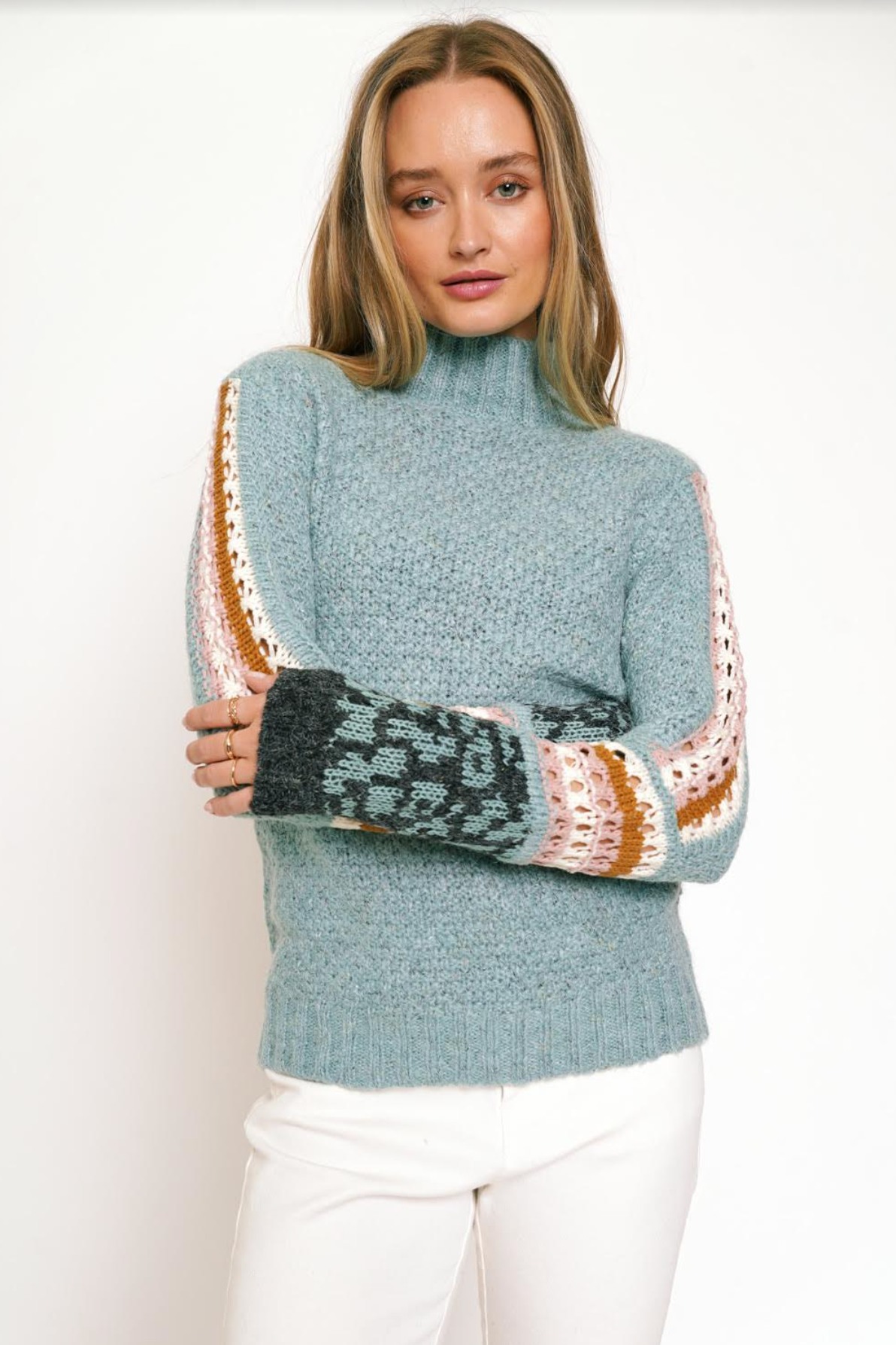 This seafoam sweater is great pop of color for Fall. It ties in bight colors and the fall print so great and looks great with some jeans and sneakers for a casual day.