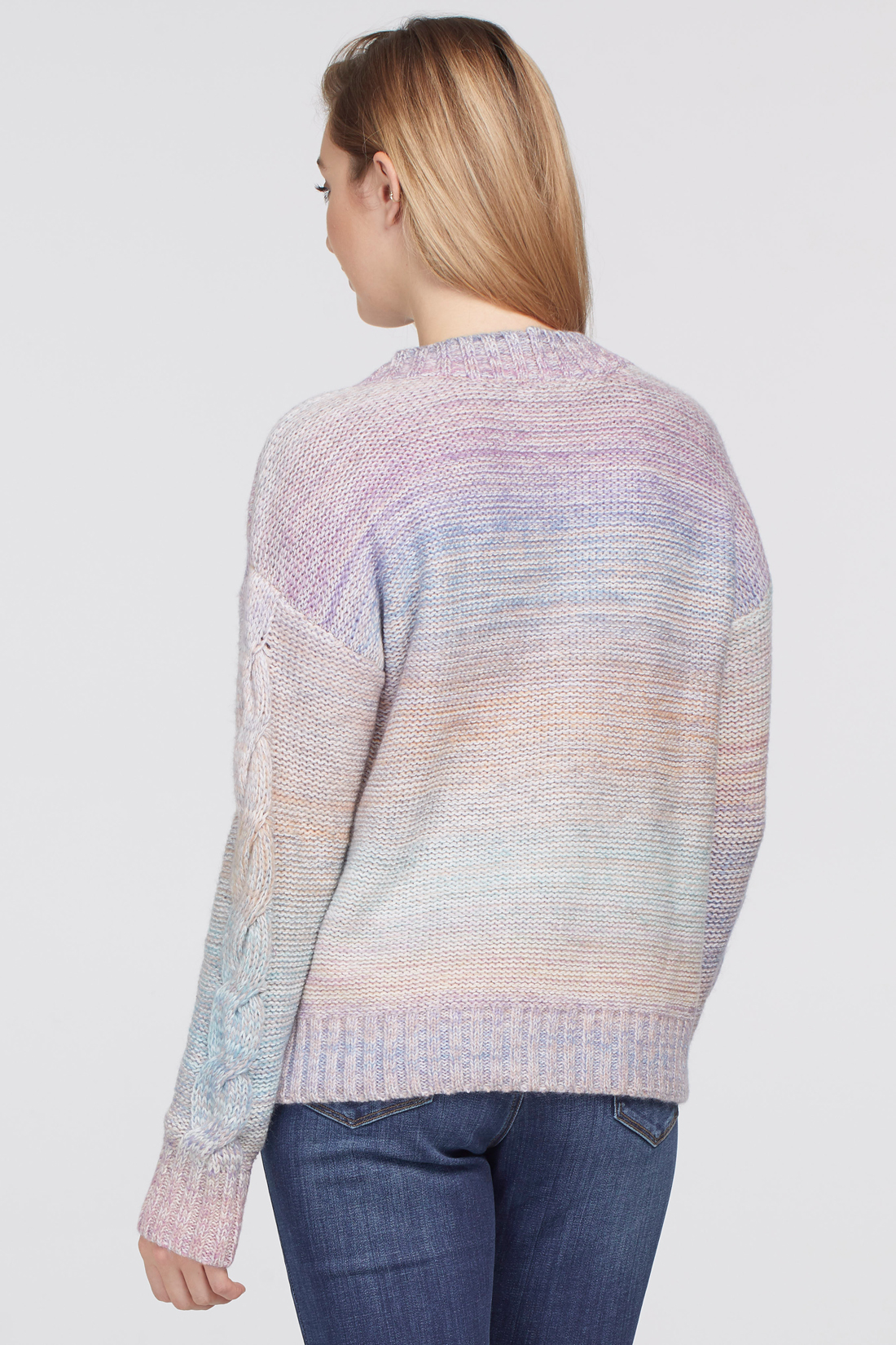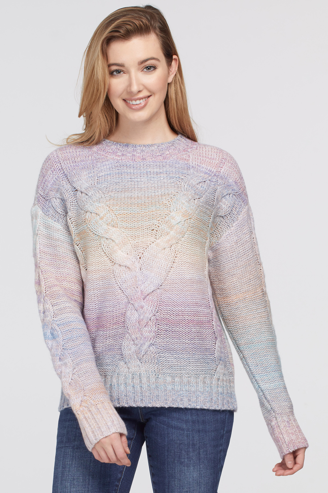 Mock neck sweater with cable detail in sugar plum. Pair with jeans for an easy fall look.