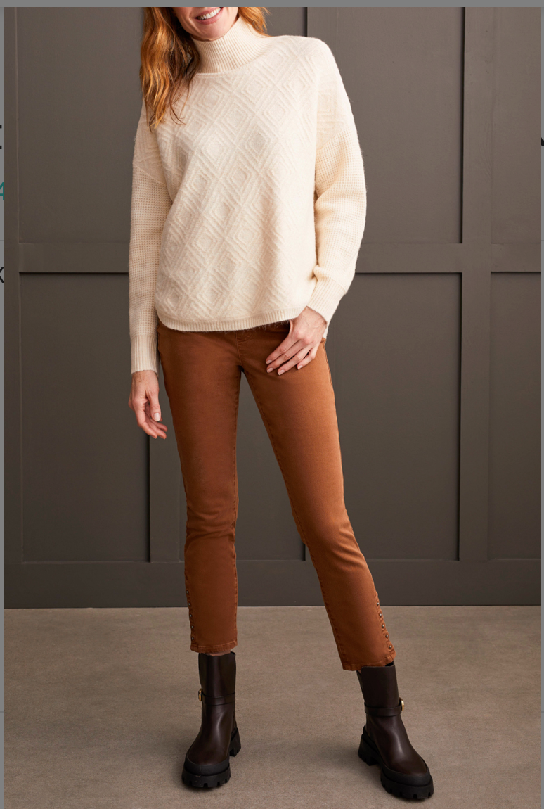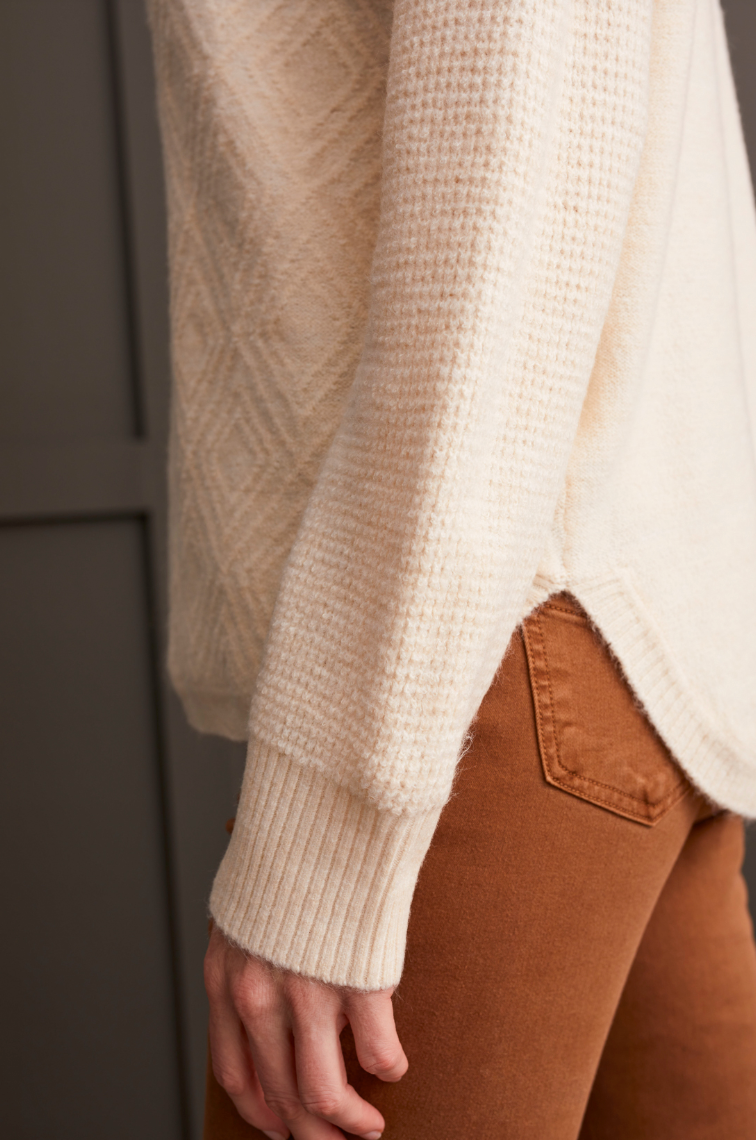 Mock neck sweater in cream with mixed texture detail. A must have fall classic.