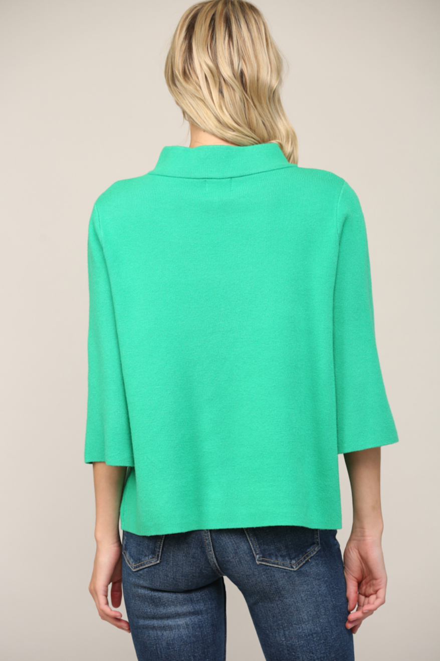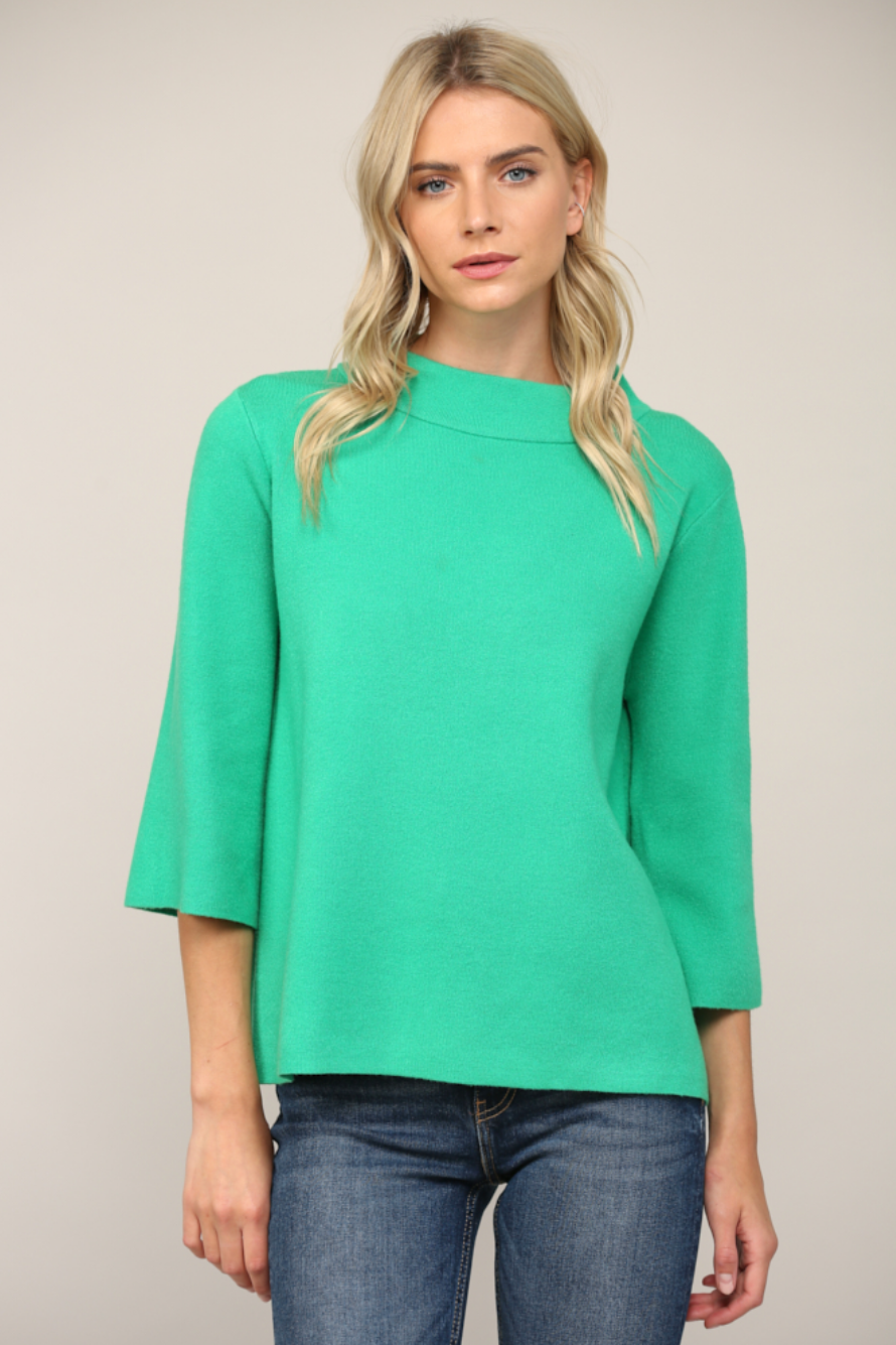This mock neck pull over sweater comes with a bell sleeve, and packed full of comfort. Loose fit. Pair with leggings and boots. Model wearing size small.