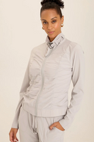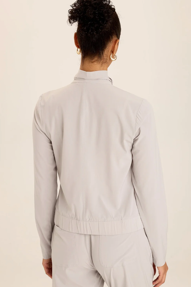 Maximum performance meets the Momentum Jacket in flexible Whisper 4-Way Stretch fabric, designed for sweat-resistant movement and easy comfort. Momentum features allover ruching on the front, an elastic cinched hemline, and a belted buckle detail at the collar for some added chic. Wear for movement or style with a casual bottom for sartorial excellence! Activewear never looks so stylish!