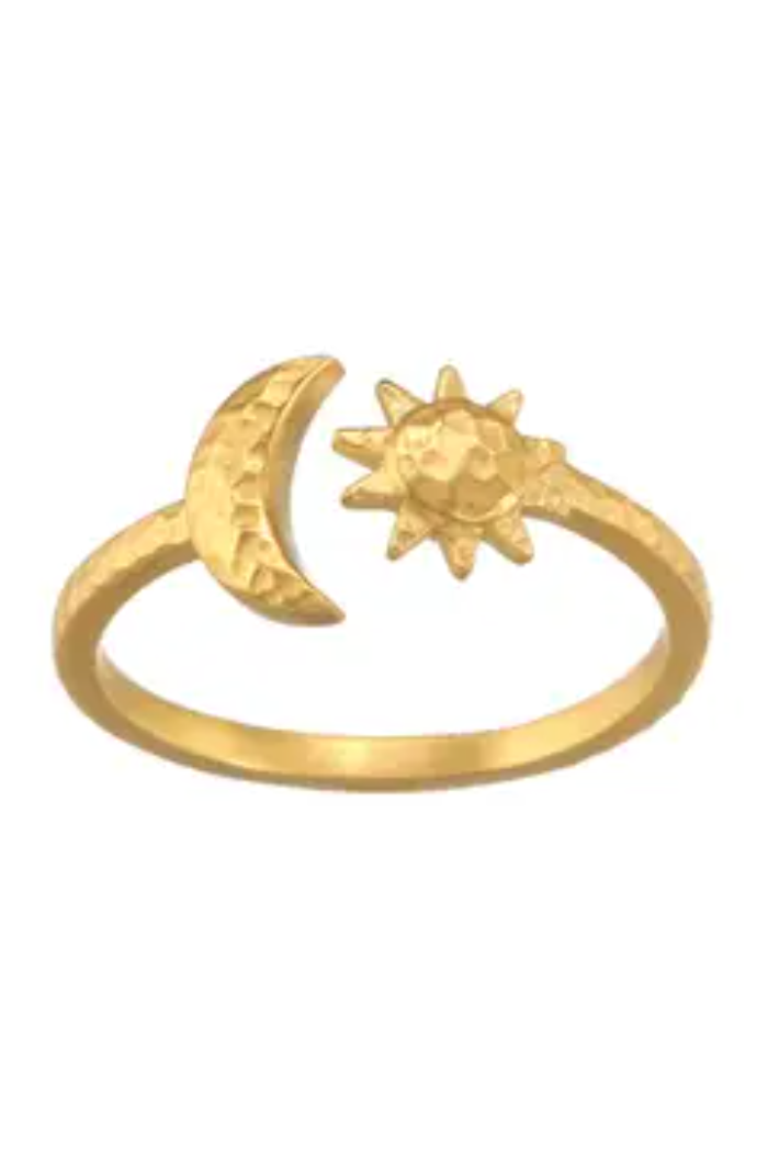 Under the light of the celestial bodies, our spirits are illuminated with ancient wisdom; we are inspired to reach for our dreams. An 18KT gold plate adjustable ring is adorned with a crescent moon and a gleaming sun, symbols of protection and vitality--perfect for layering or wearing alone.