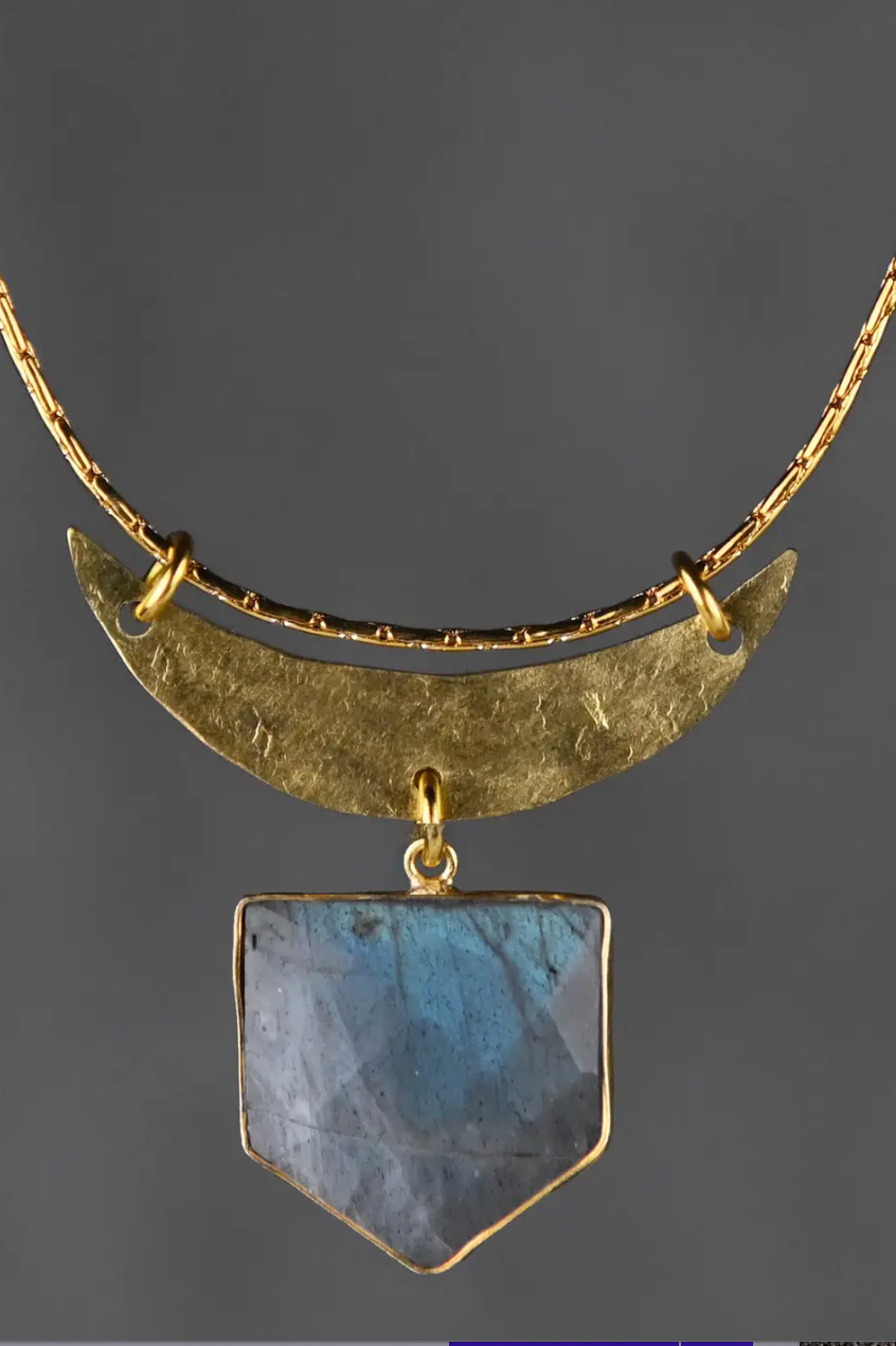 his necklace features your choice of a beautiful Semi Precious Stone hanging from a hammered Crescent Moon on faceted brass chain with Gold plating.