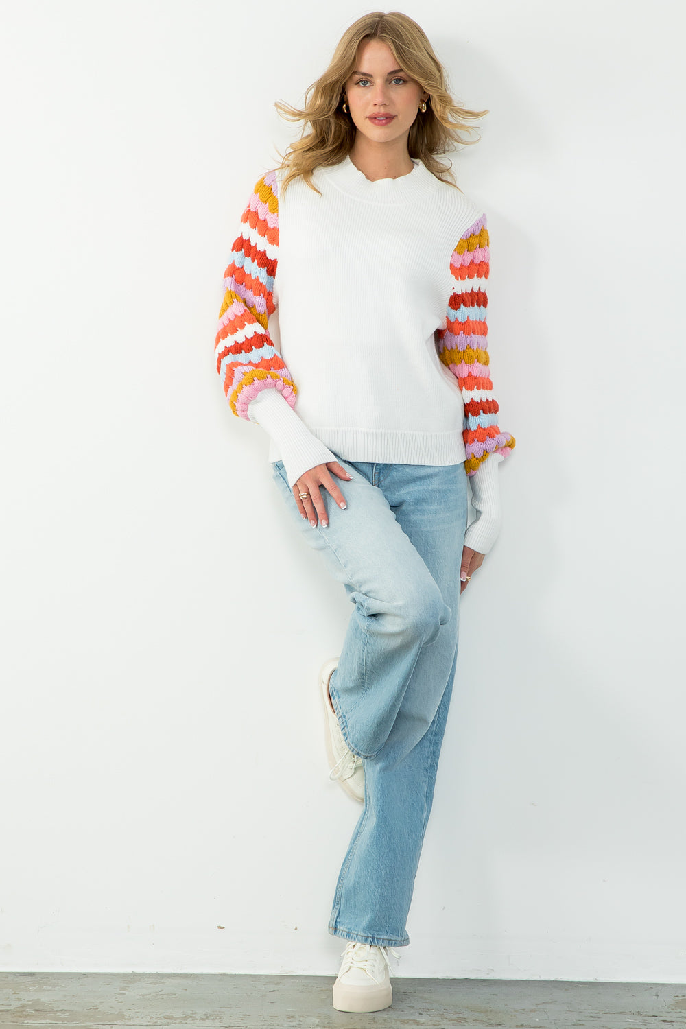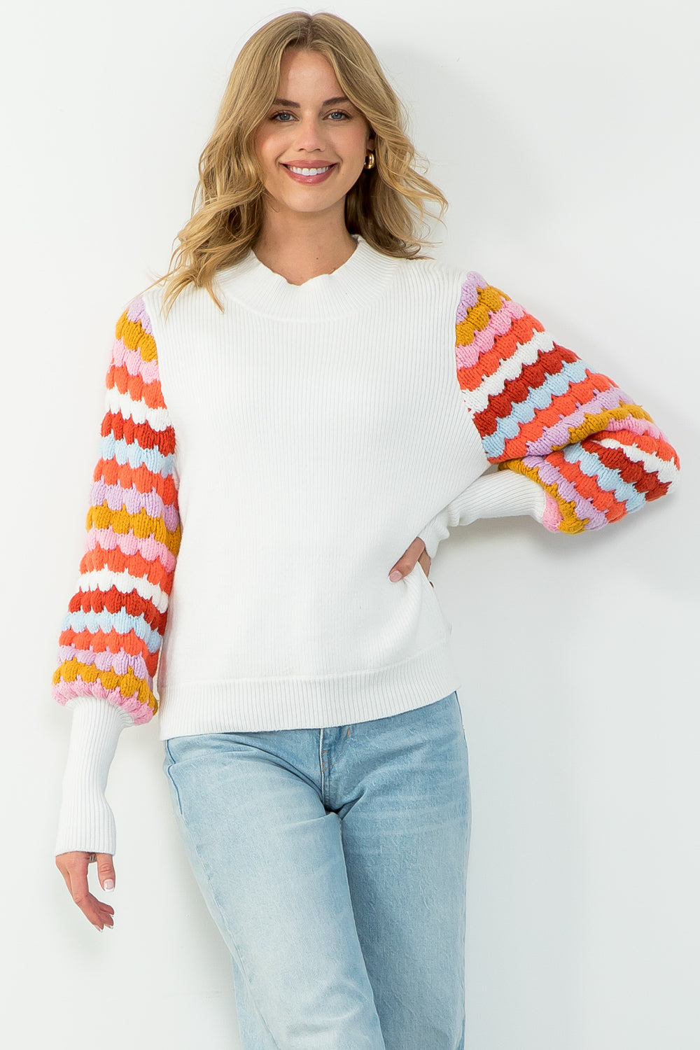 The added various vibrant colors on the sleeves of this knit sweater will bring a bright energy to your outfit! Looks great paired with jeans.l