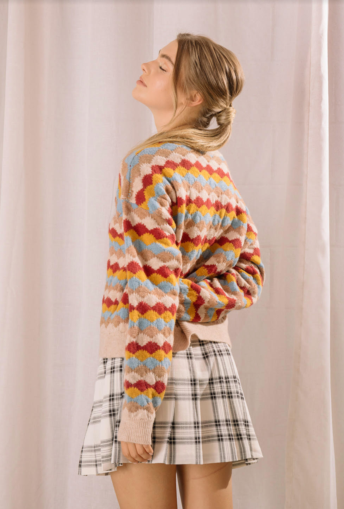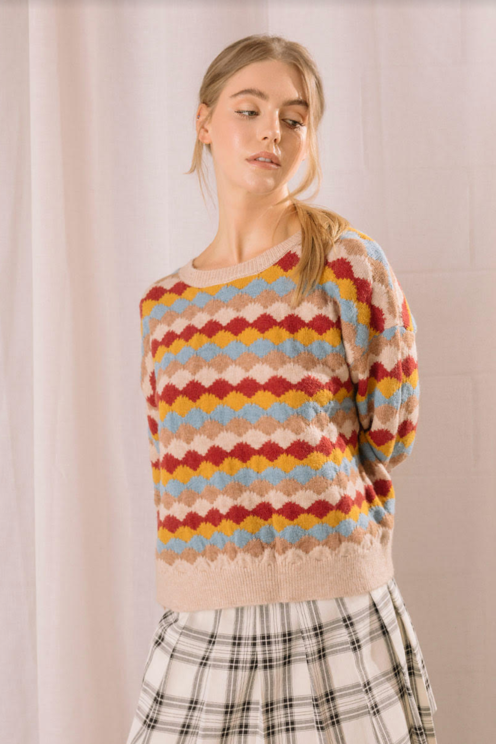 This beige multi sweater looks great with blue jeans. It is a nice pop of color for any fall outfit.