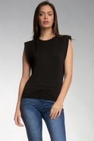 Padded shoulders, muscle cut. This isn't your average tank. Dress up or down. Office or evening out. Model wearing size small.
