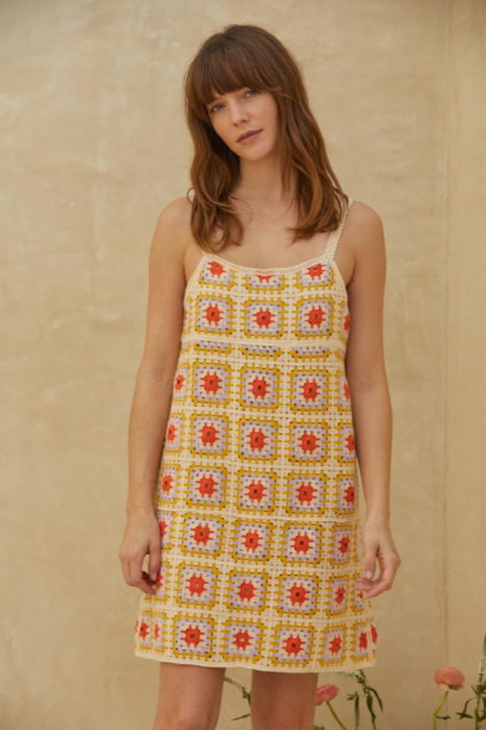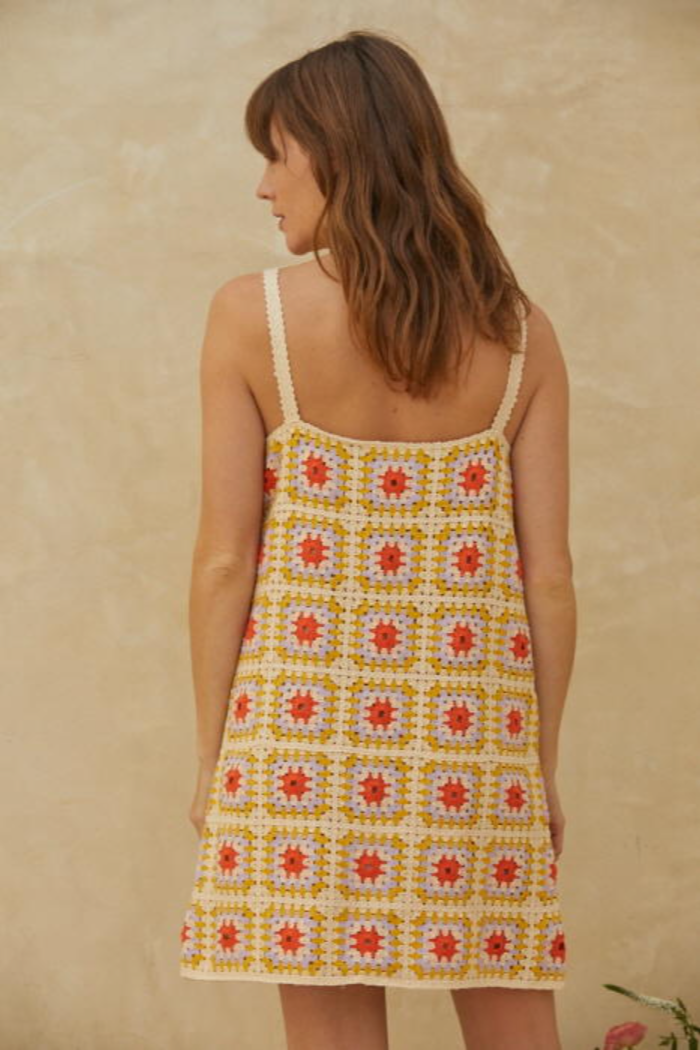 Knitted crochet sweater round neck spaghetti strap mini dress with lining. Wedge shoes, high boots or heels. This dress will hold up to your every whim.