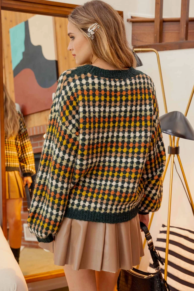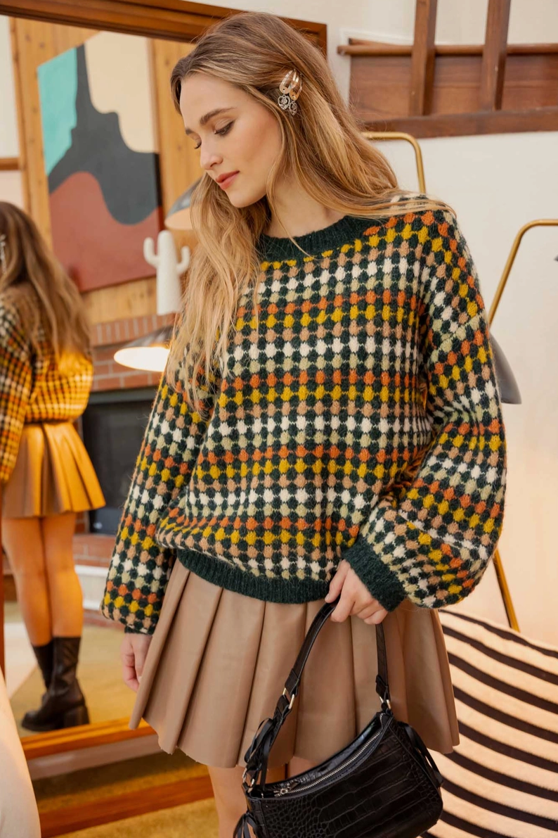 Get ready for fall by wearing the Multi Color Crewneck Pullover Sweater! This sweater has a round crew neckline as well as a hexagon knit pattern that contains all your favorite fall colors.