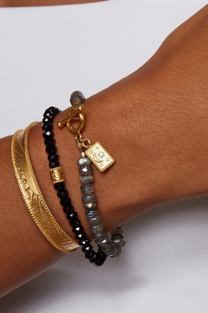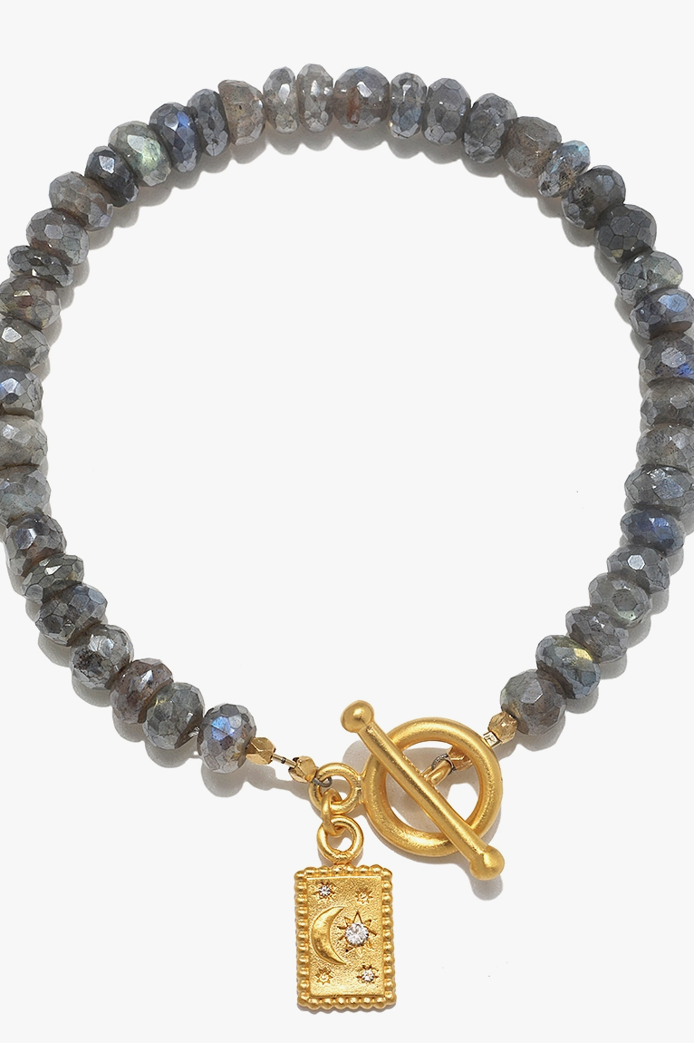 Labrodorite bracelet with celestial charm in 18 kt gold plate. Wear alone or layered.