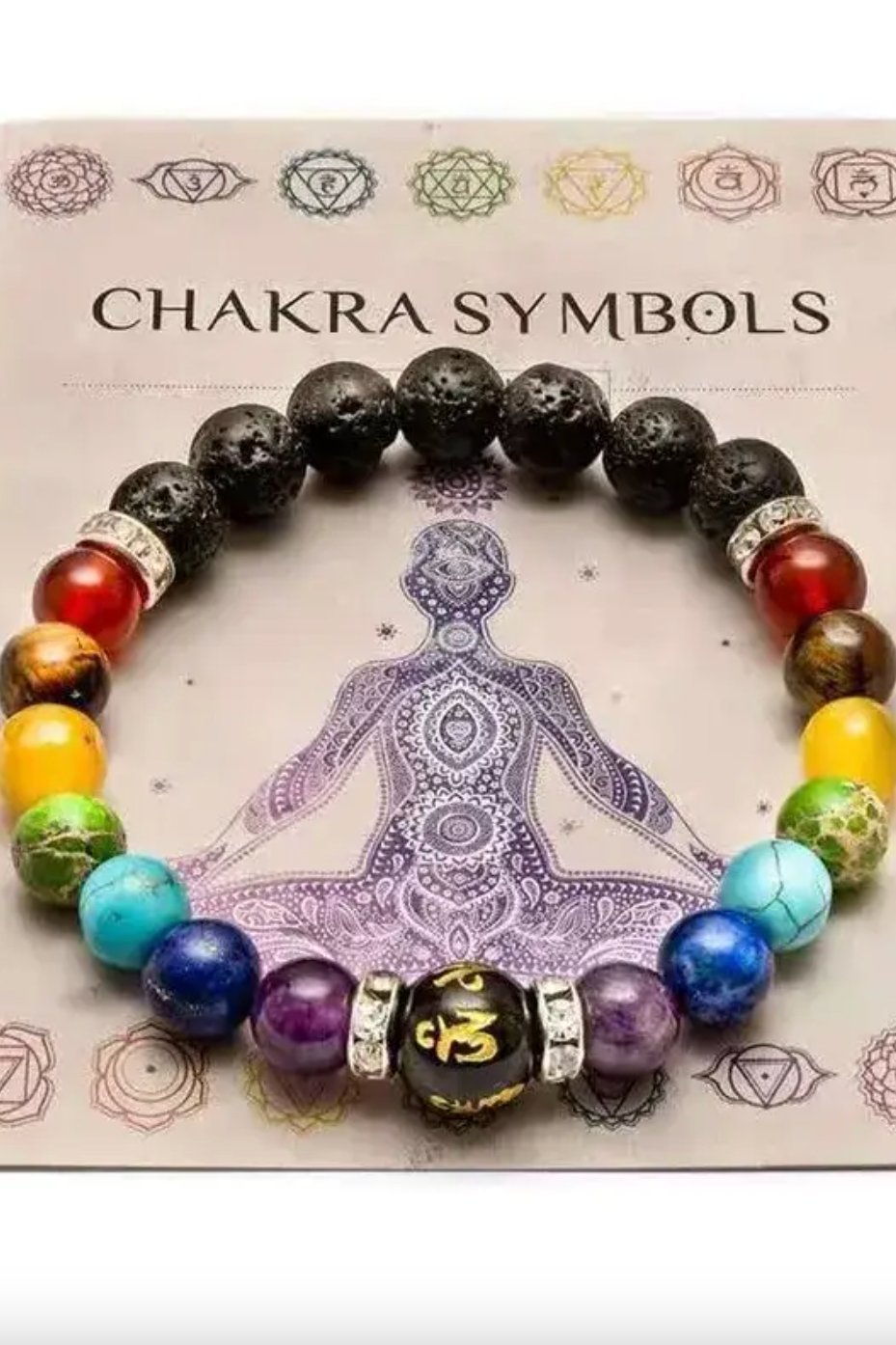 This natural stone bracelet featuring chakra symbols is truly stunning. It is beautifully crafted and vibrant in color.