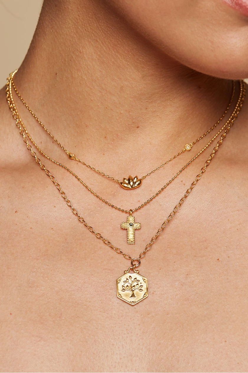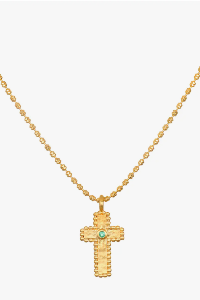 Centered in our faith, we open our hearts to the beauty and wonder of the world around us. An 18kt gold plate cross pendant shines with an emerald, stone of wisdom, abundance, and grace. Delicate beading on the edge of the pendant compliments the shining beaded necklace chain.