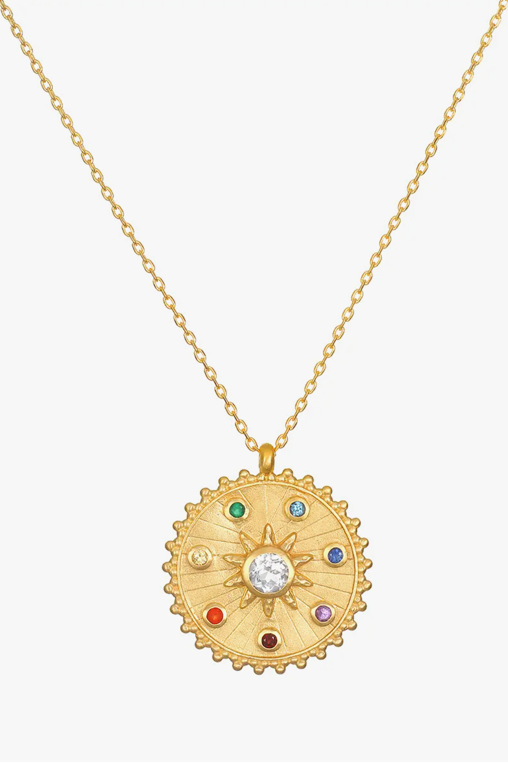 Our vital life energy is continuous; our sacred light cannot be extinguished. An 18kt gold plated necklace is adorned with a coin pendant gleaming with seven brilliant gemstones. Each corresponds to the seven chakras, or sacred energy points, that exist within us. In the center, a white topaz—stone of creativity, individuality, and awareness, radiates light.