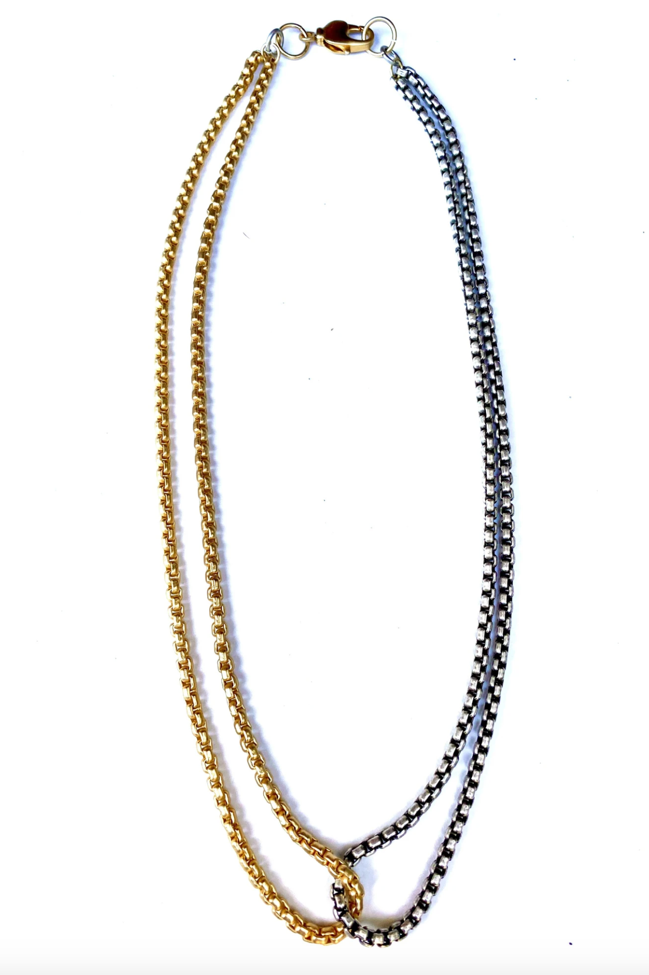 Mixed matte gold and antique silver Venetian chains twisted in front, 16". Great necklace to layer with.