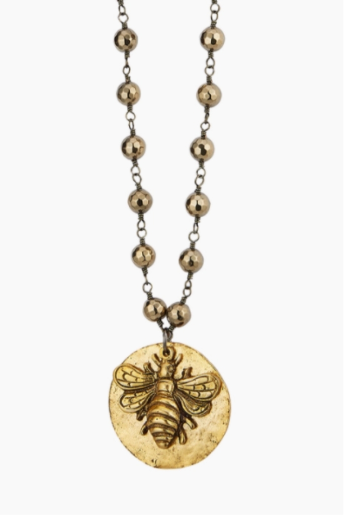 Necklace with 16" pyrite chain and gold bee and gold disc pendant.