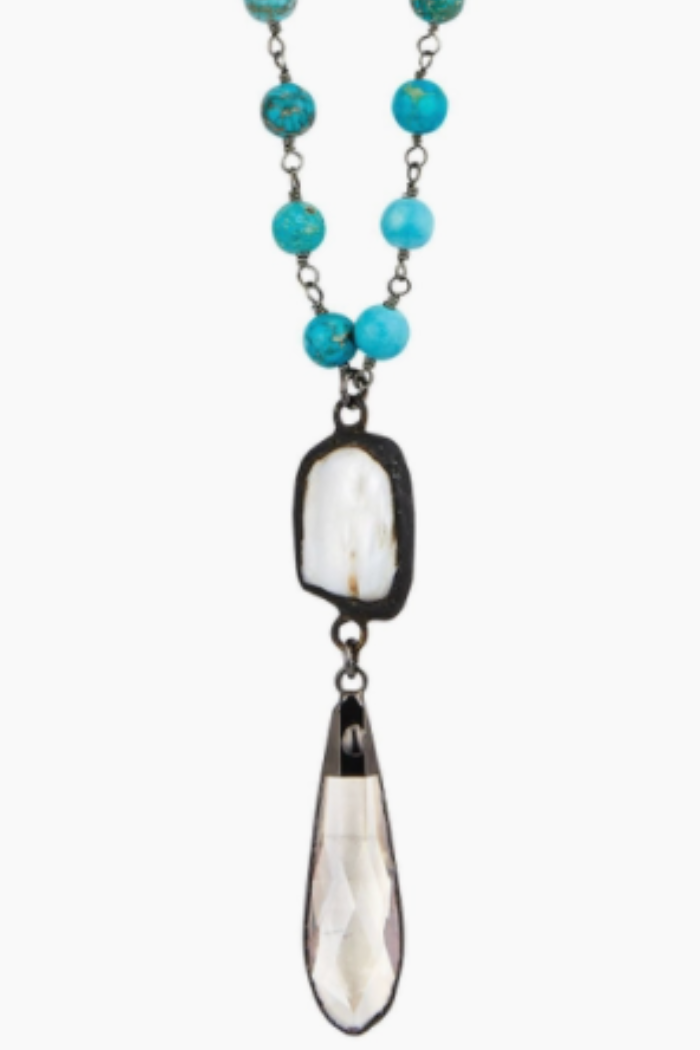 Necklace with turquoise varisite and hematite chain and stone pendant.