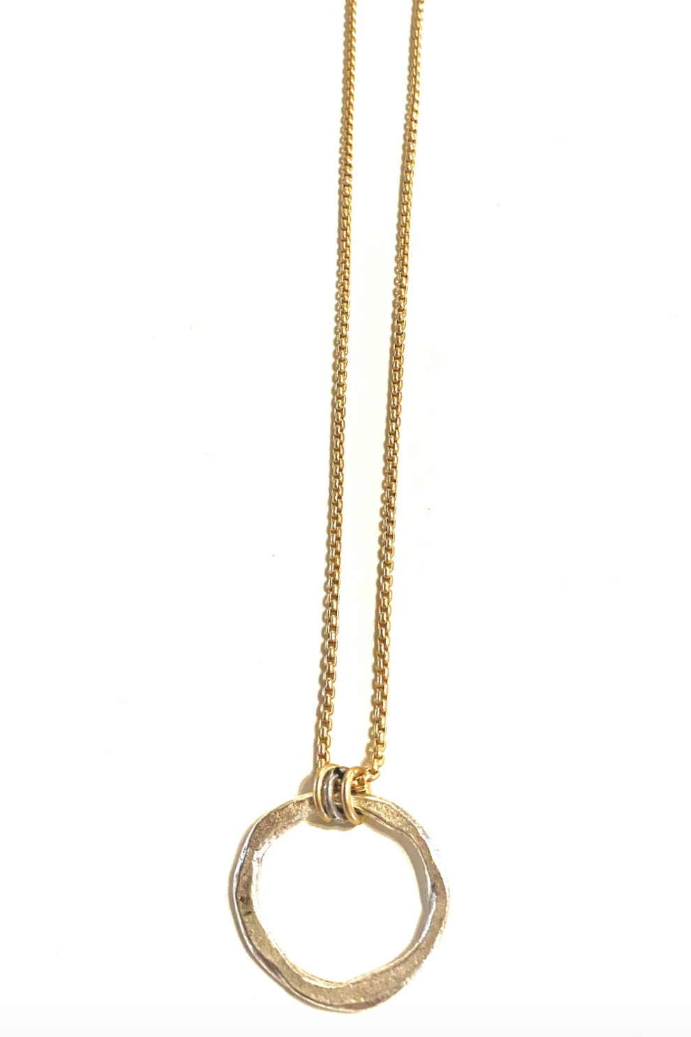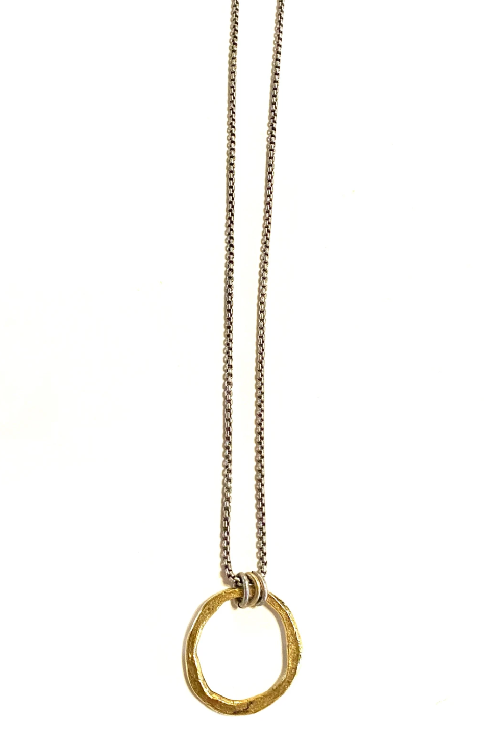 Easy necklace to layer with. Chain and hammered circle pendant are different metals.