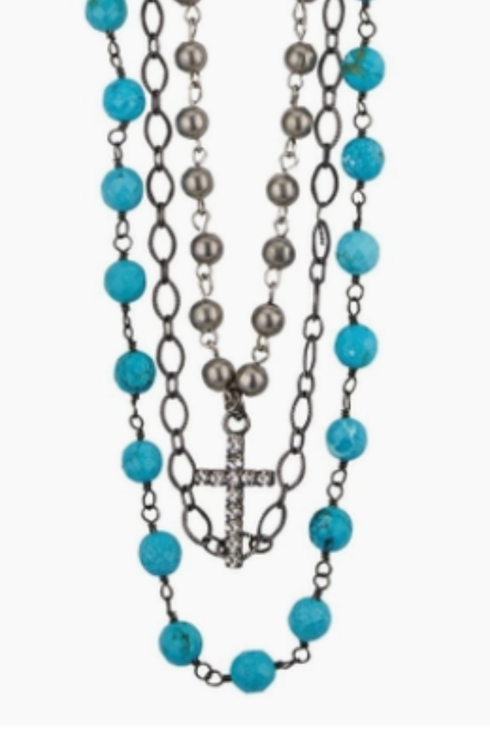 Triple strand "bundle of necklaces" in turquoise with pave' cross.