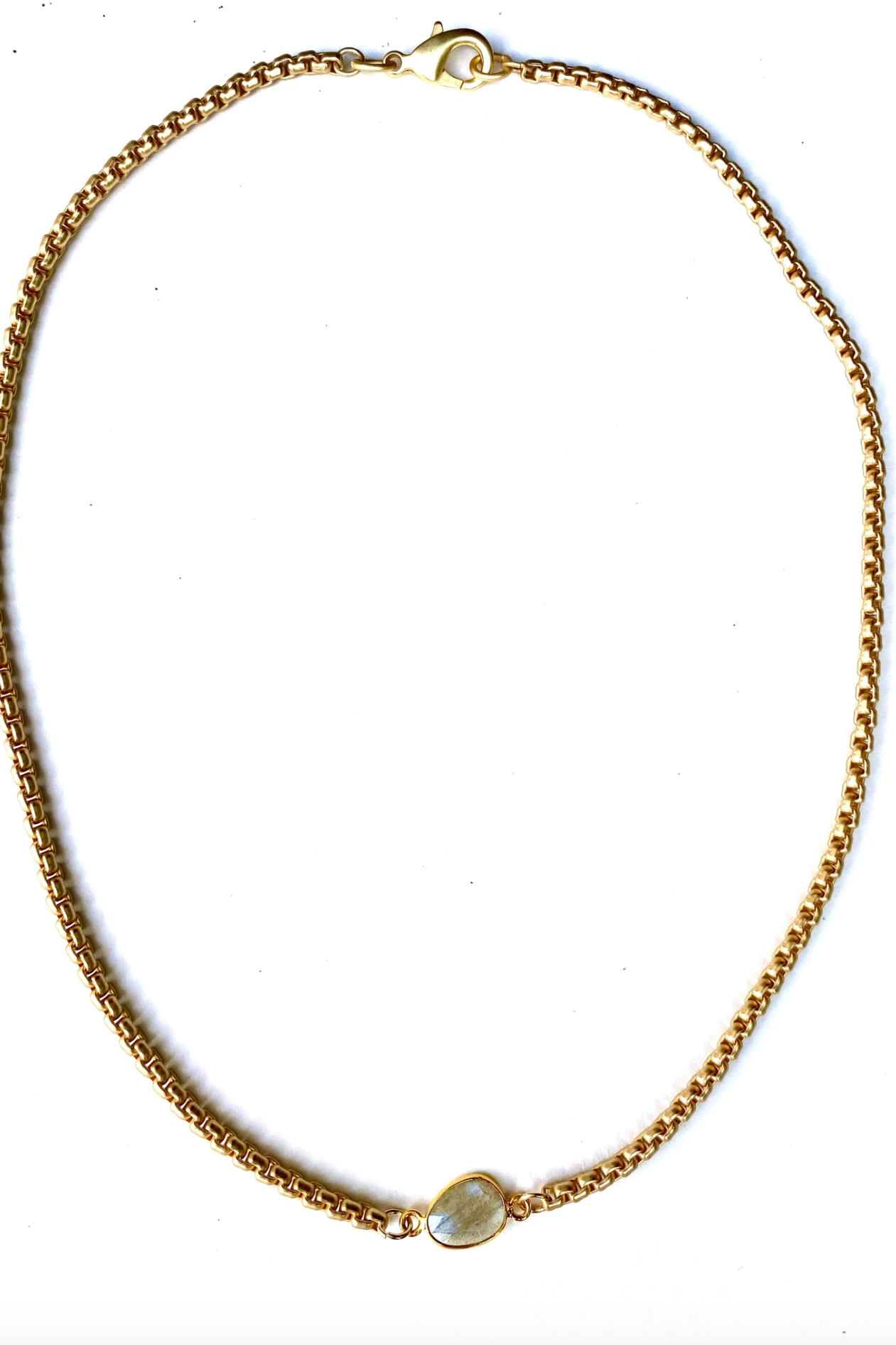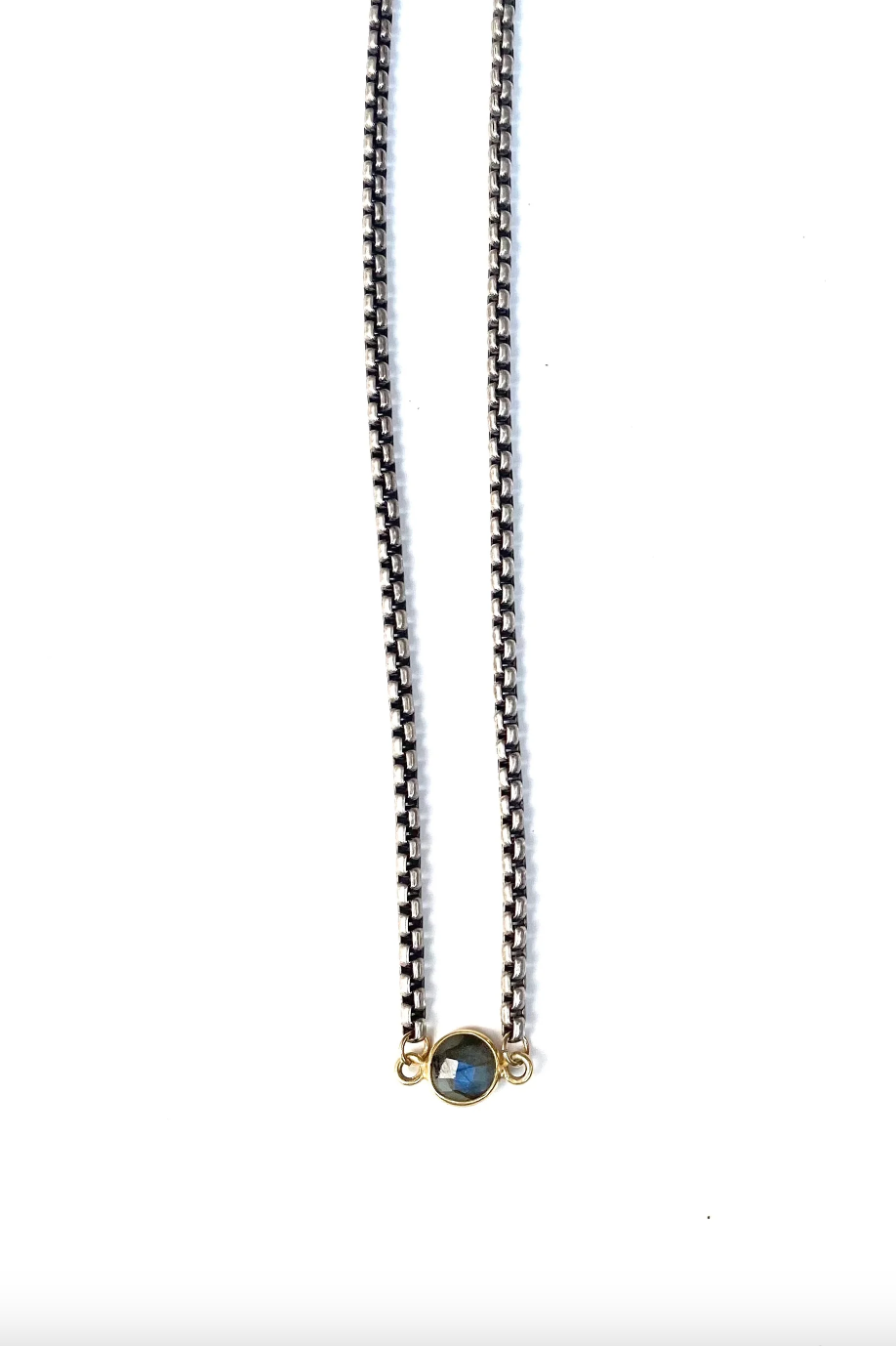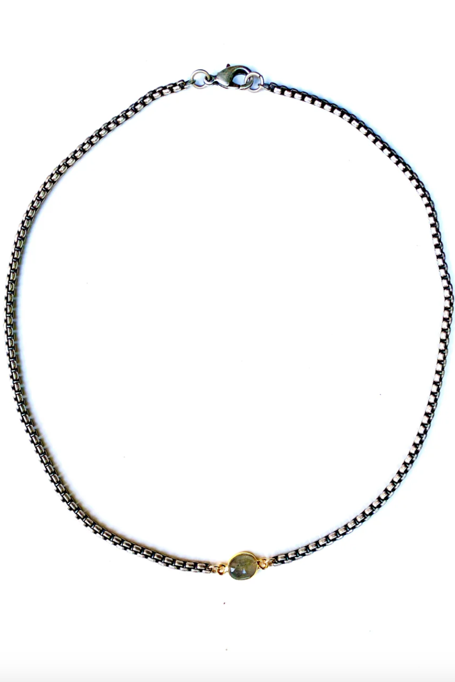 Antique silver venetian chain necklace with bezel-set semi-precious stone connector; labradorite