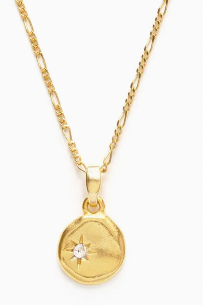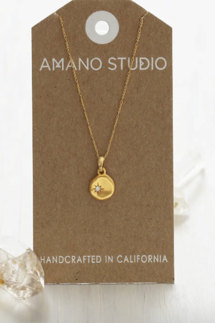 The North Star or Polaris can be your point of navigation in the night sky. This single star on the hand carved pendant is set with a Czech crystal. It is made of gold plated brass. The chain is 20" long with a ring at 18" so it can be adjusted to various lengths. The chain is also coated to resist tarnish and create a hypoallergenic surface.