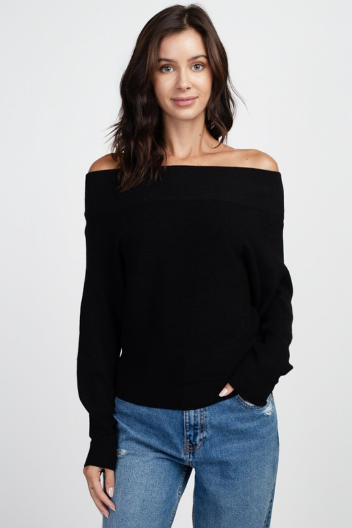 Off the shoulder, super soft, slight crop length. This an upgrade on the basic must have. Pair with slacks or jeans. Model wearing size S/M