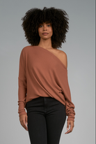 This off the shoulder top is super cozy. The long sleeves and length make it great to travel in and wear cozy at home.