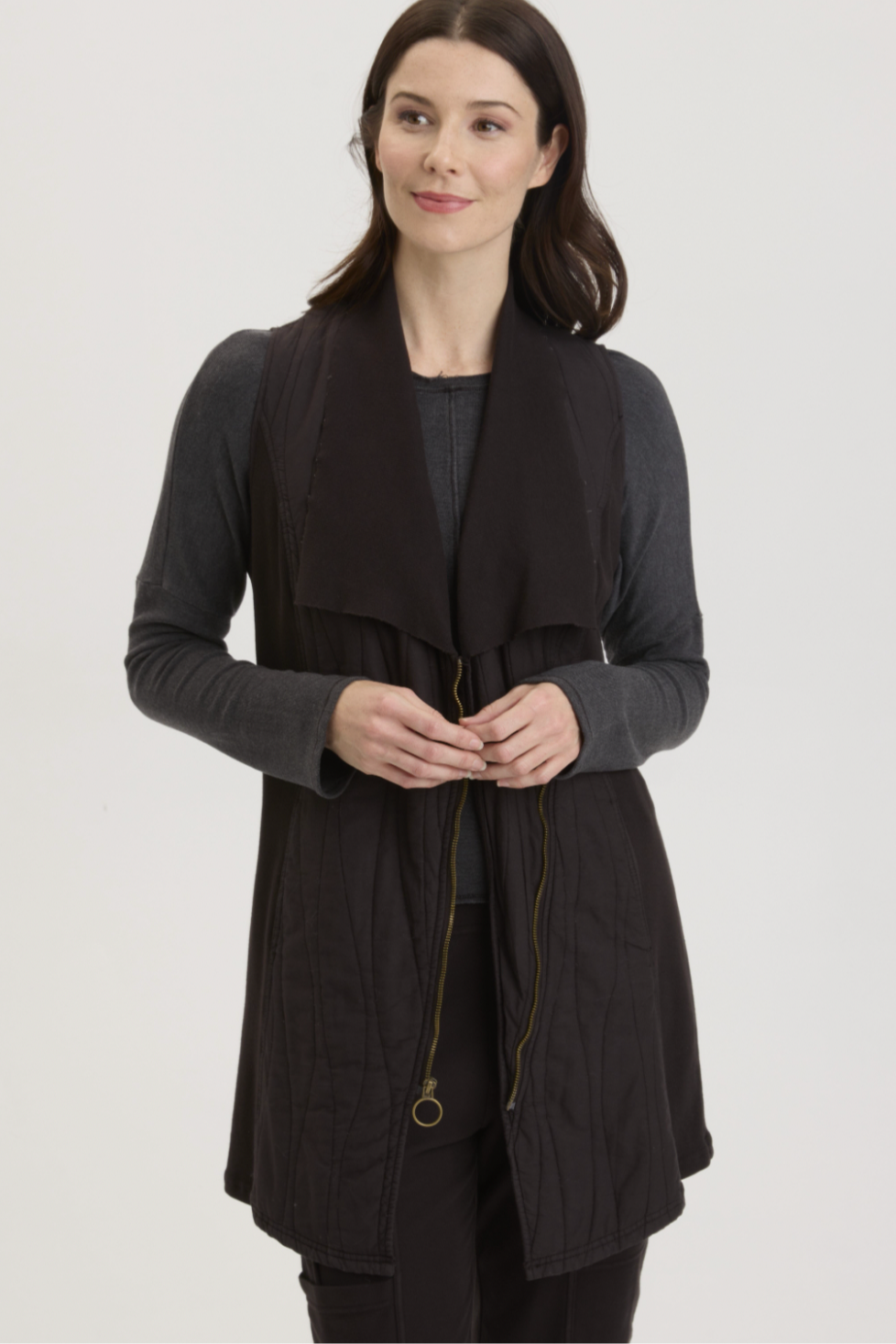 Mid length quilted vest with collar and contrast zipper in brass color. Pair with the Caraf Legging, style # 22927.