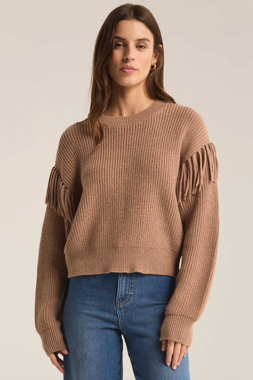 Elevate your look with this crew neck sweater, featuring long sleeves and eye-catching fringe detail at the shoulders. Perfect for adding a touch of vintage flair to your cozy wardrobe essentials.