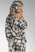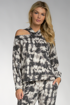 Can we say best of both worlds? One shoulder hoodie has it all. Fun tie dye print, peek a boo shoulder. Model wearing size small.