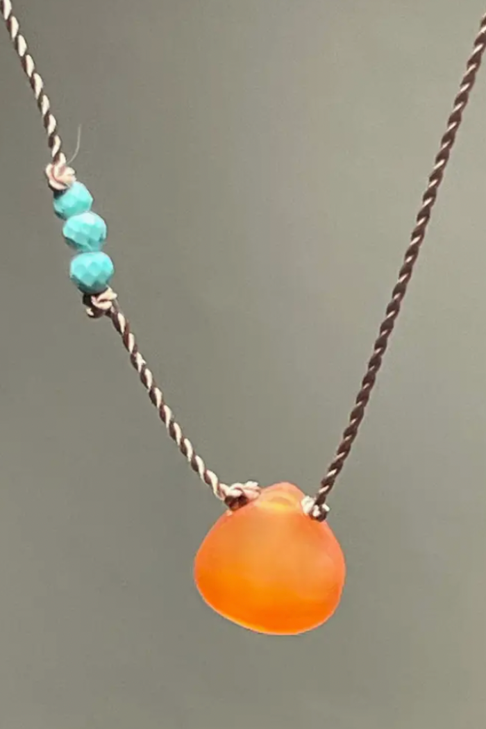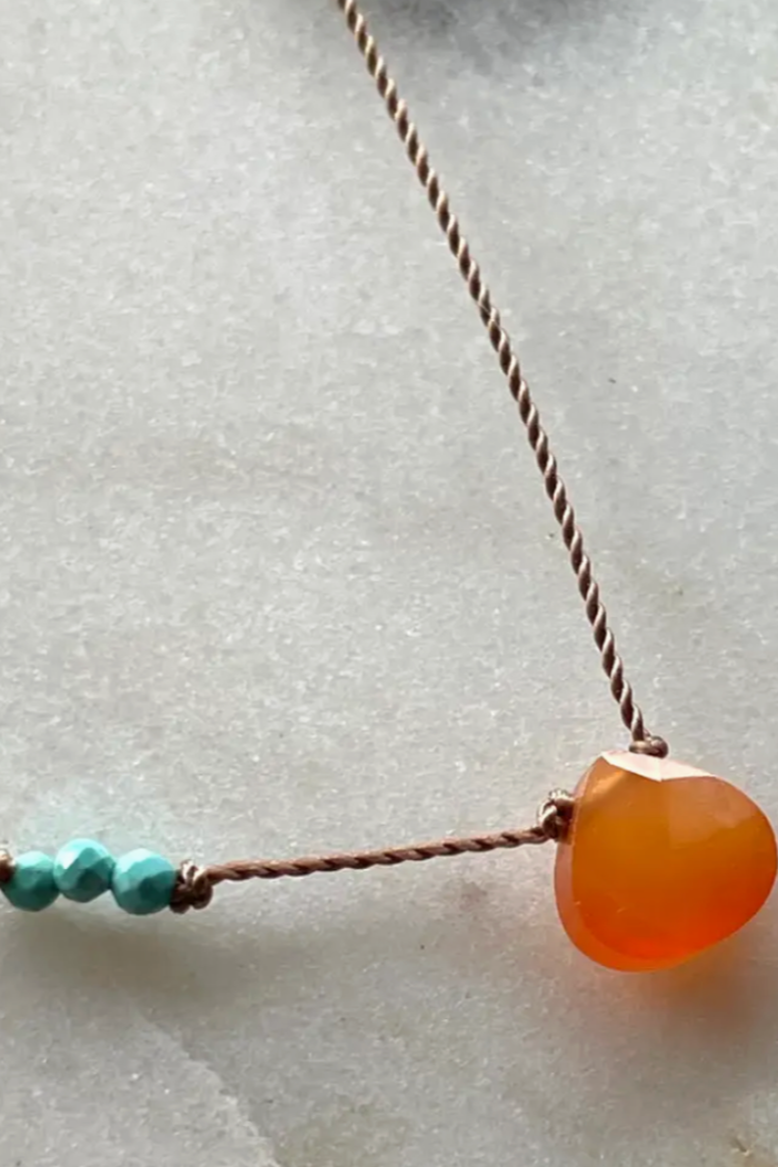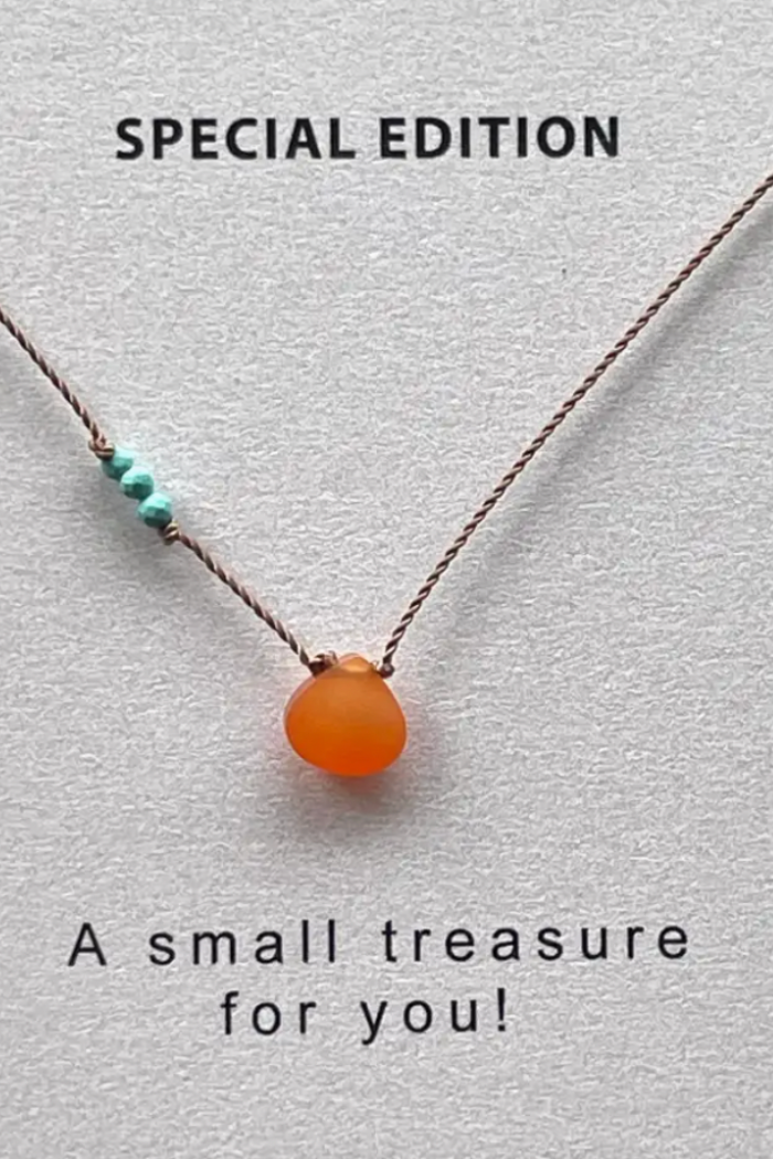 Special edition necklace featuring delicate and sparkly gemstones of orange carnelian and tiny faceted turquoise beads that are hand knotted along a thin, durable nylon cord. Finished with a sterling silver spring ring clasp and made to 17". Packaged on a pretty card with stone meaning ready for gifting.