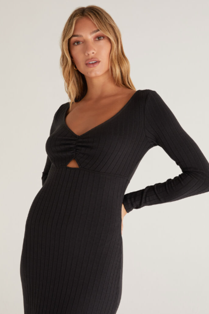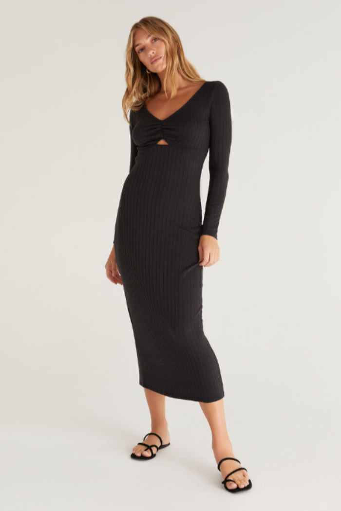 The little black dress is back! The Orla Rib Midi Dress is made using our 10x3 Wide Rib fabric and features a flattering, body hugging fit with a flirty peekaboo detail at the v-neckline. The full midi length accentuates curves and will have her feeling confident all season.