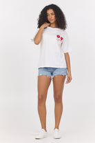 These fun graphic tees are soft and flowy. Pair with skirts and shorts and head out!