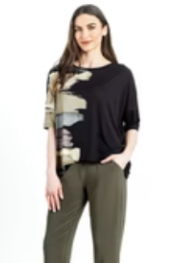Why color inside the lines? Our Paint Stroke Loose Cut Side Tipped Top will transform you into a walking piece of artwork! This style features a scoop neckline, elbow-length raglan sleeves, with a side-tipped hemline.