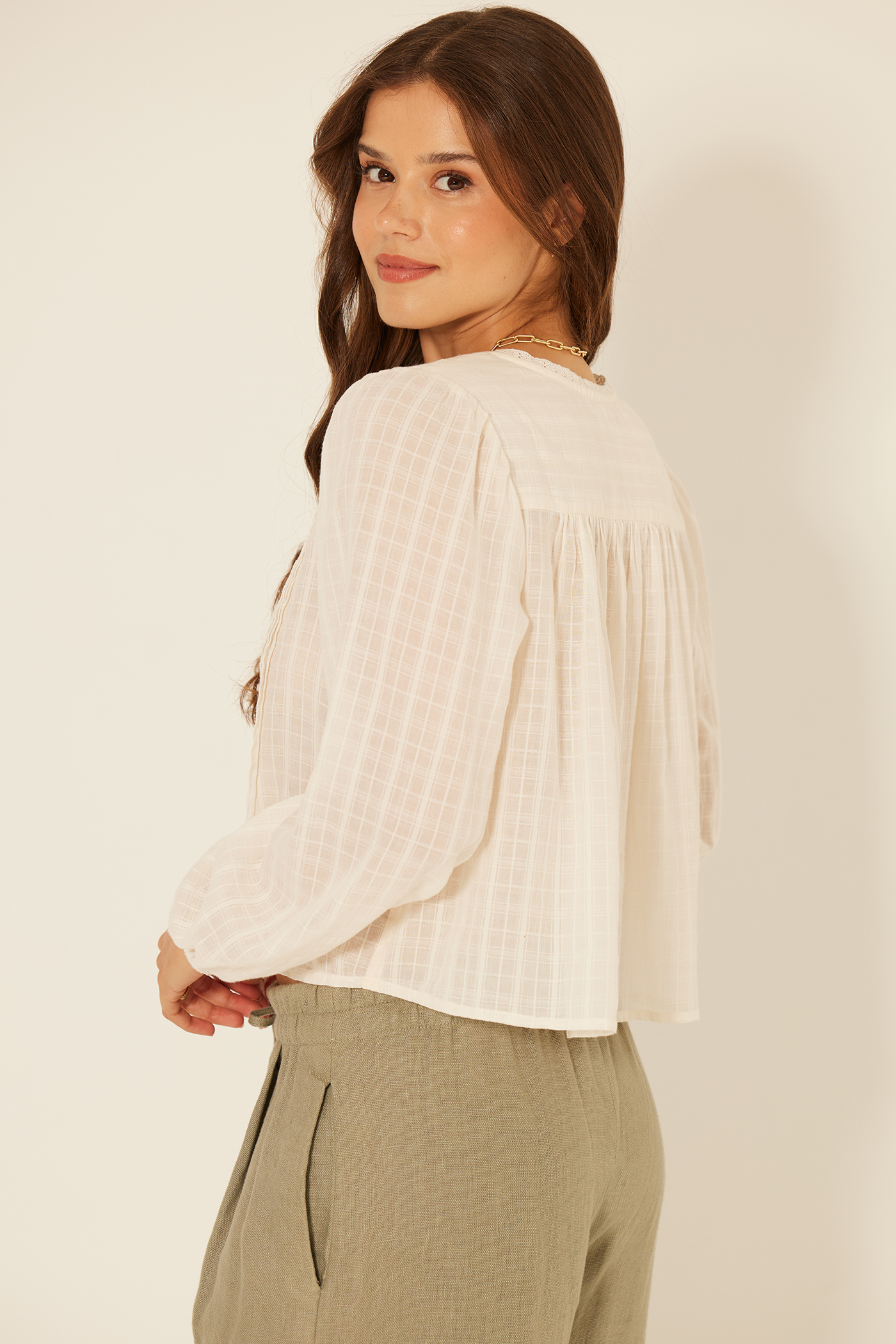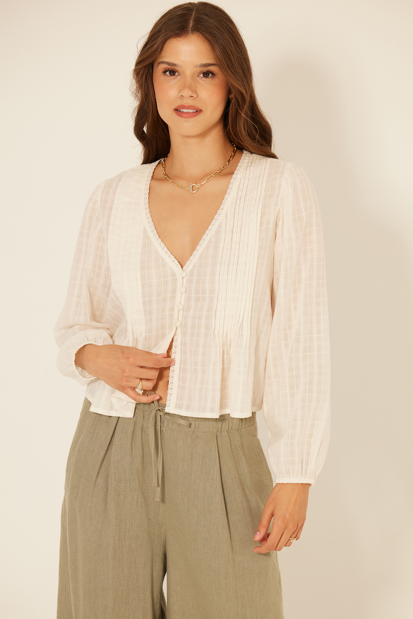 Effortlessly elevate your wardrobe with the Palacios Top! This long sleeve top features unique button and pleat details, adding an extra touch of sophistication to any outfit.