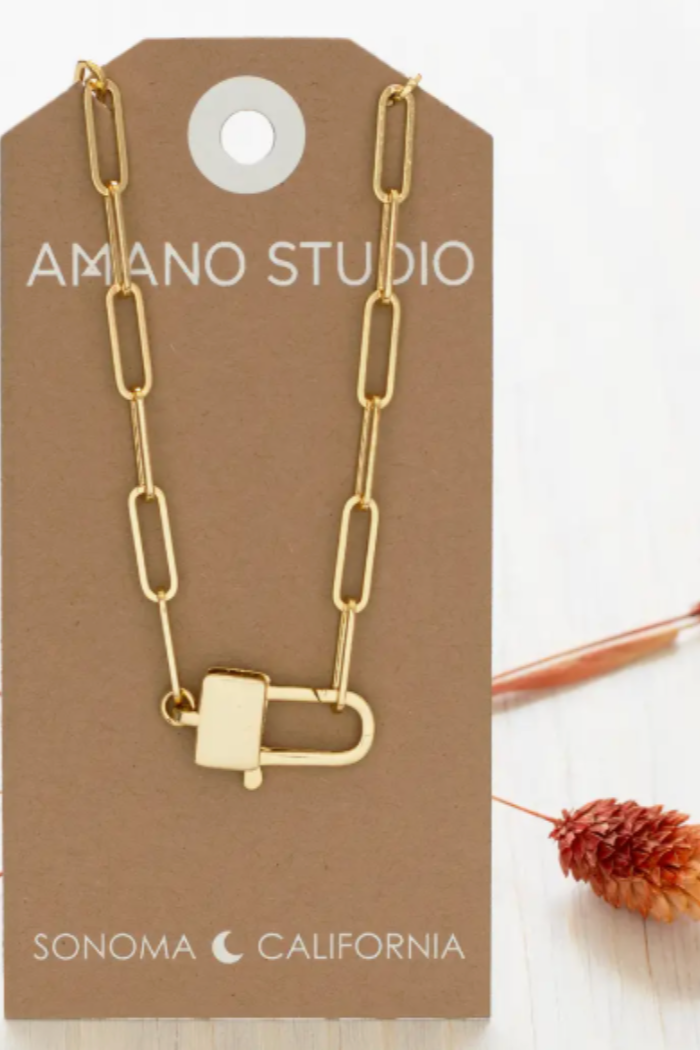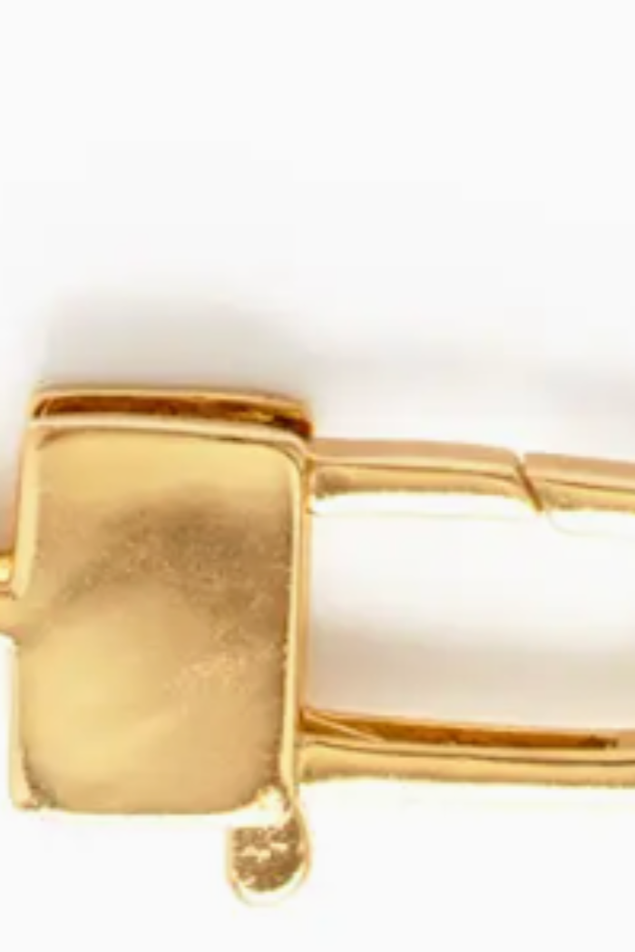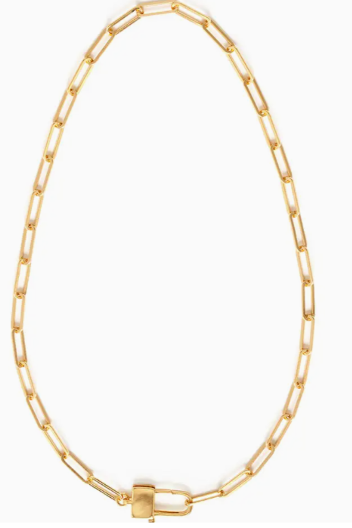 The paperclip chain trend is still going strong! We've added this cool padlock clasp to give it an edgy statement. The chain is 18" and made of 14k gold plated brass + coated to resist tarnish and create a hypoallergenic surface.