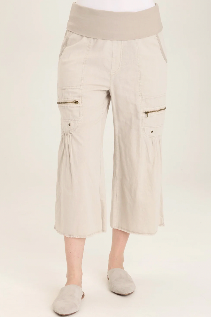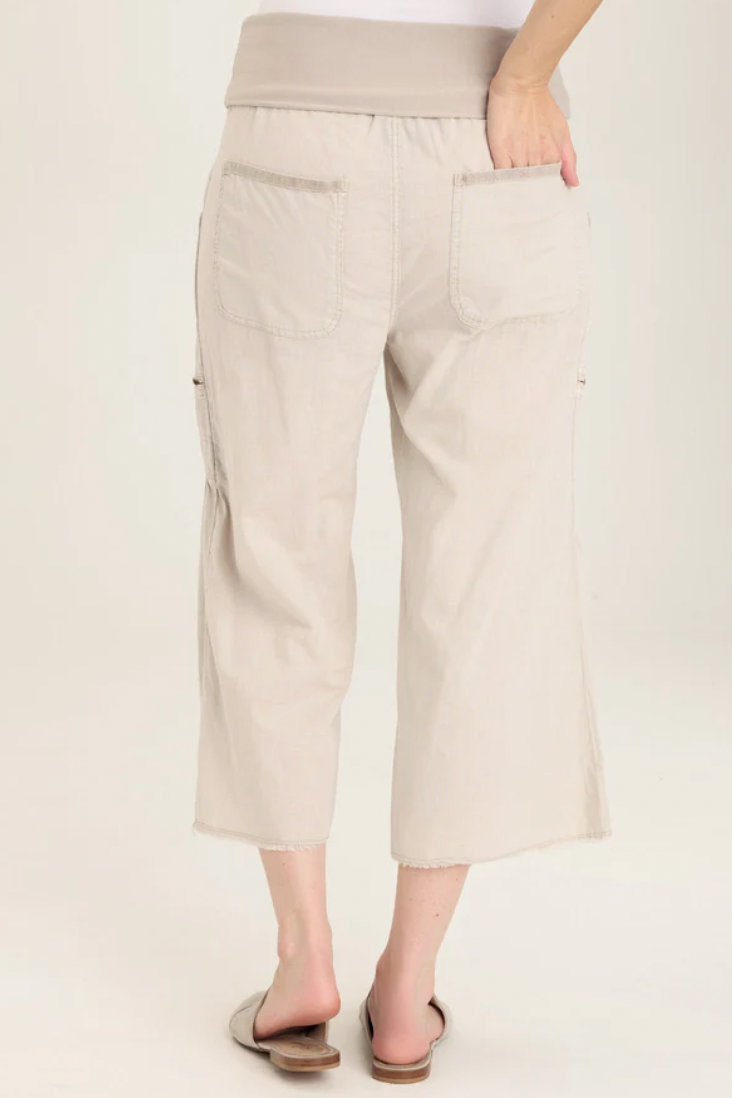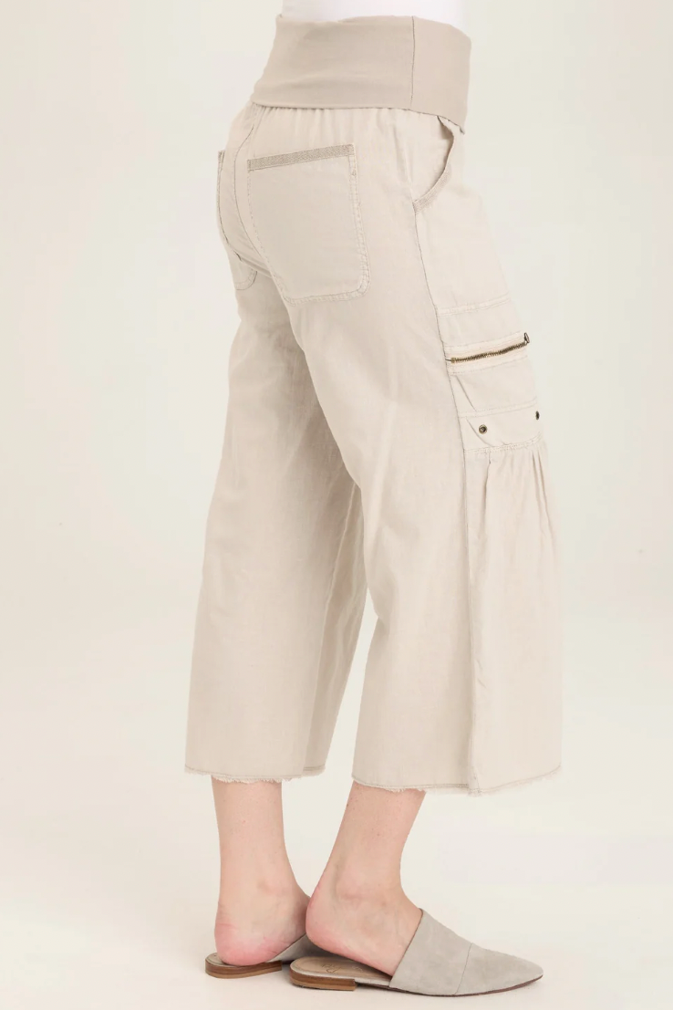 Pasqual Crop features raw edges on semi-wide leg opening. With a foldover waist and clean cargo pockets, this flowing crop gives structure and fun!