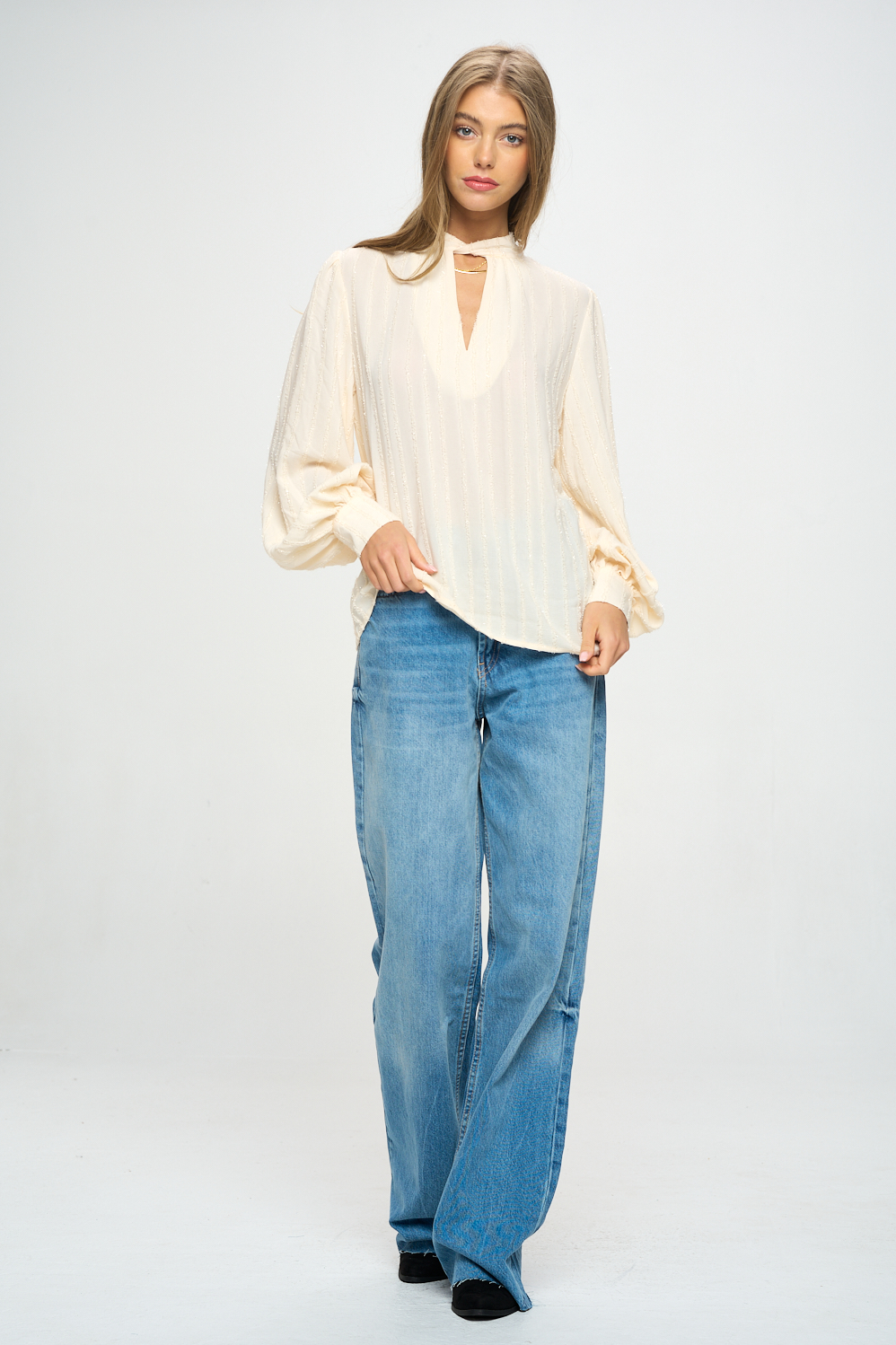 Mock neck with a peak a boo front detail. Tie back with an additional peak a boo detail. With a hint of sparkle this top makes a contender for holiday events or a night out. Pair with jeans.