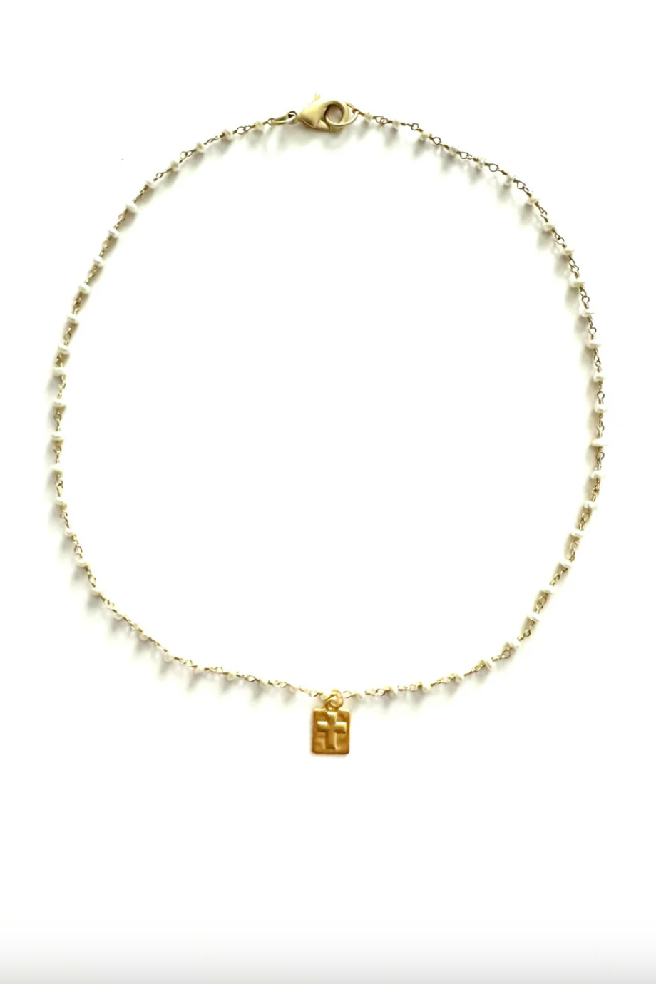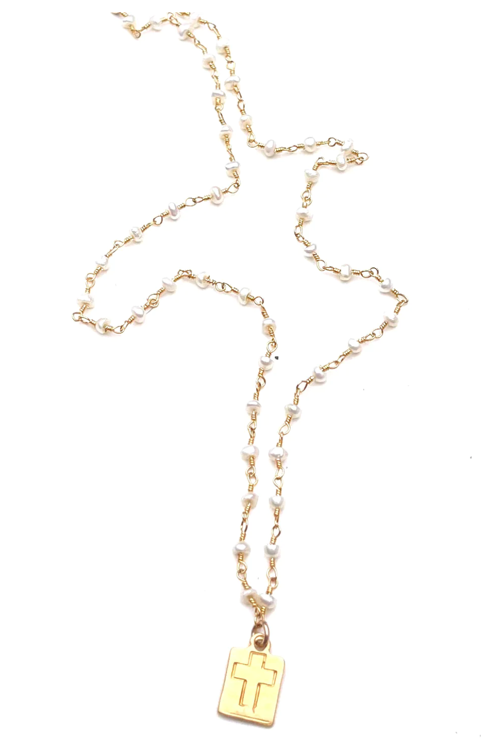 Dainty pearl rosary with vermeil cross pendant; 16"