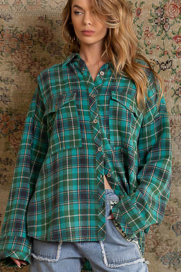 A plaid top that has a relaxed fit, perfect for a cozy fall day! Stand out in the beautiful teal color of this plaid pattern. Can be paired with jeans to achieve the best look.