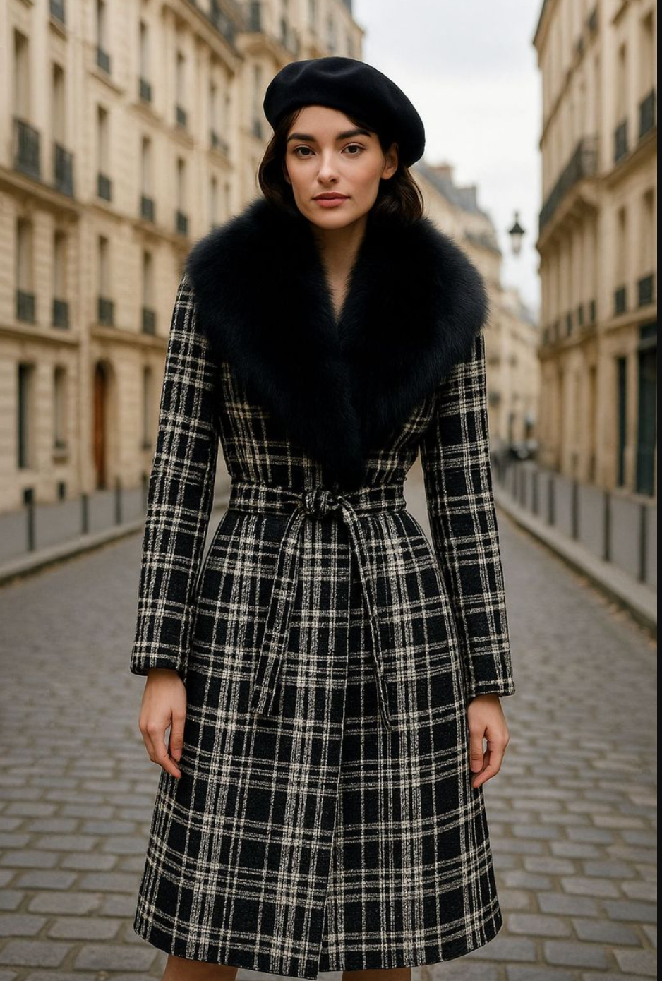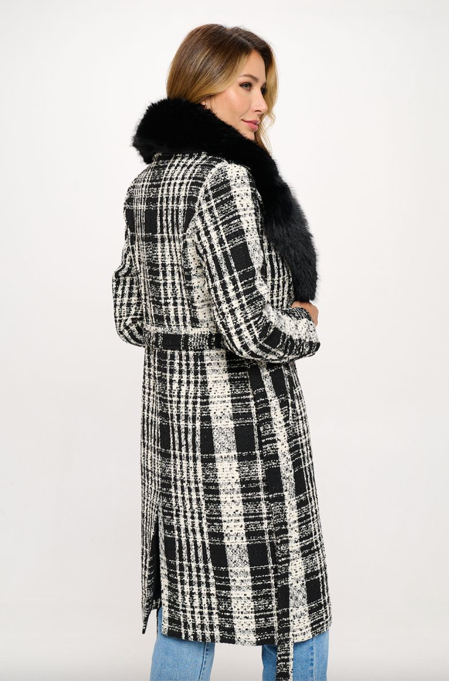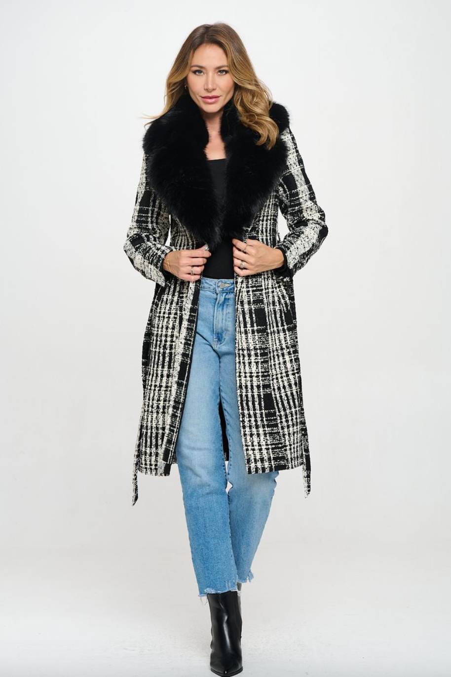 Plaid vegan wool coat in black multi with white details. Fur collar is removable and belt is optional.