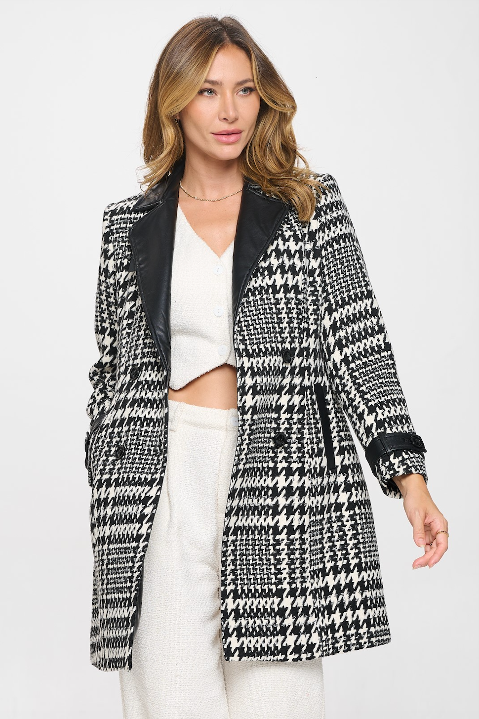 This Plaid Wool Coat w/ Vegan Leather Collar is a great jacket to add to your closet for the fall/winter season! The jacket features leather accents such as the collar and pocket flaps, and has a button closure.