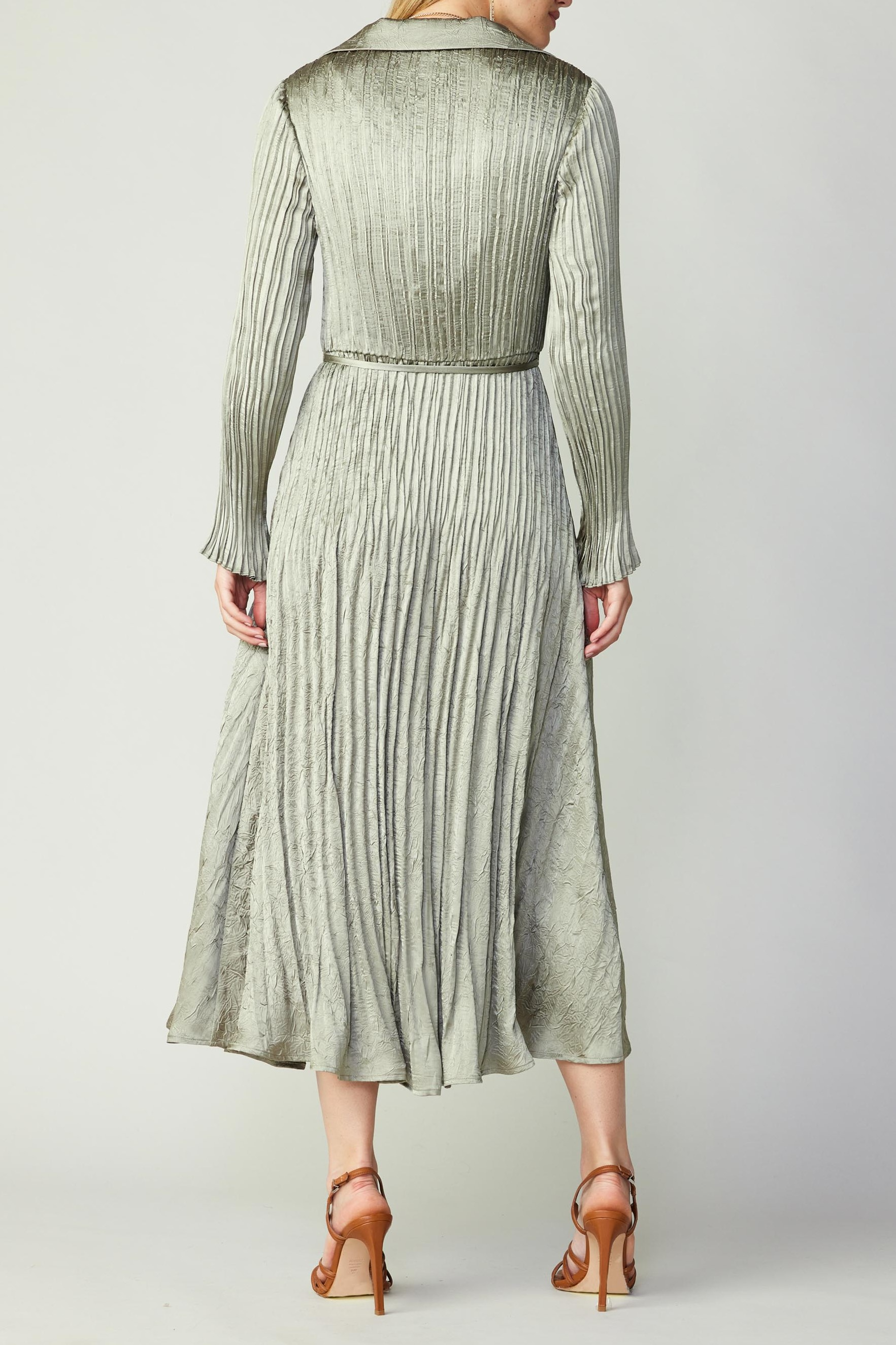 Feel elegant in this midi dress. This dress has wrinkled and pleated detailing as well as a front button closure. The tie at the waist allows you to wear this dress in a tighter or looser fit.