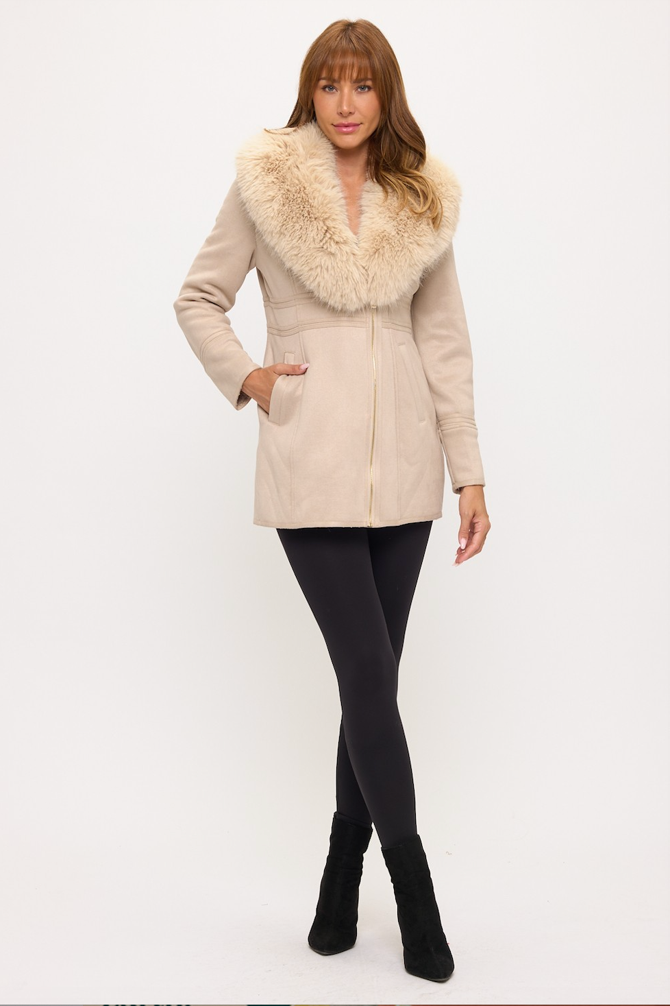 Plush vegan suede coat in creme with a coordinating lush fur collar.