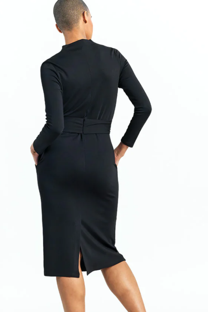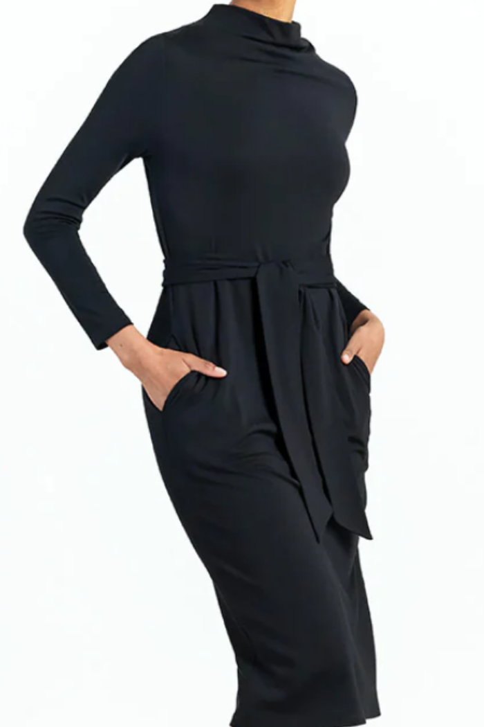 If you're looking for that timeless dress that will last for years to come, then look no further than our Lightweight Ponte Tie Waist Pocket Midi Dress! This figure-flattering dress features a soft-draped funnel neckline, long sleeves, belt-loop tie waist, side pockets, a sheath midi hemline with a vertical back seam, and a 10" back slit.