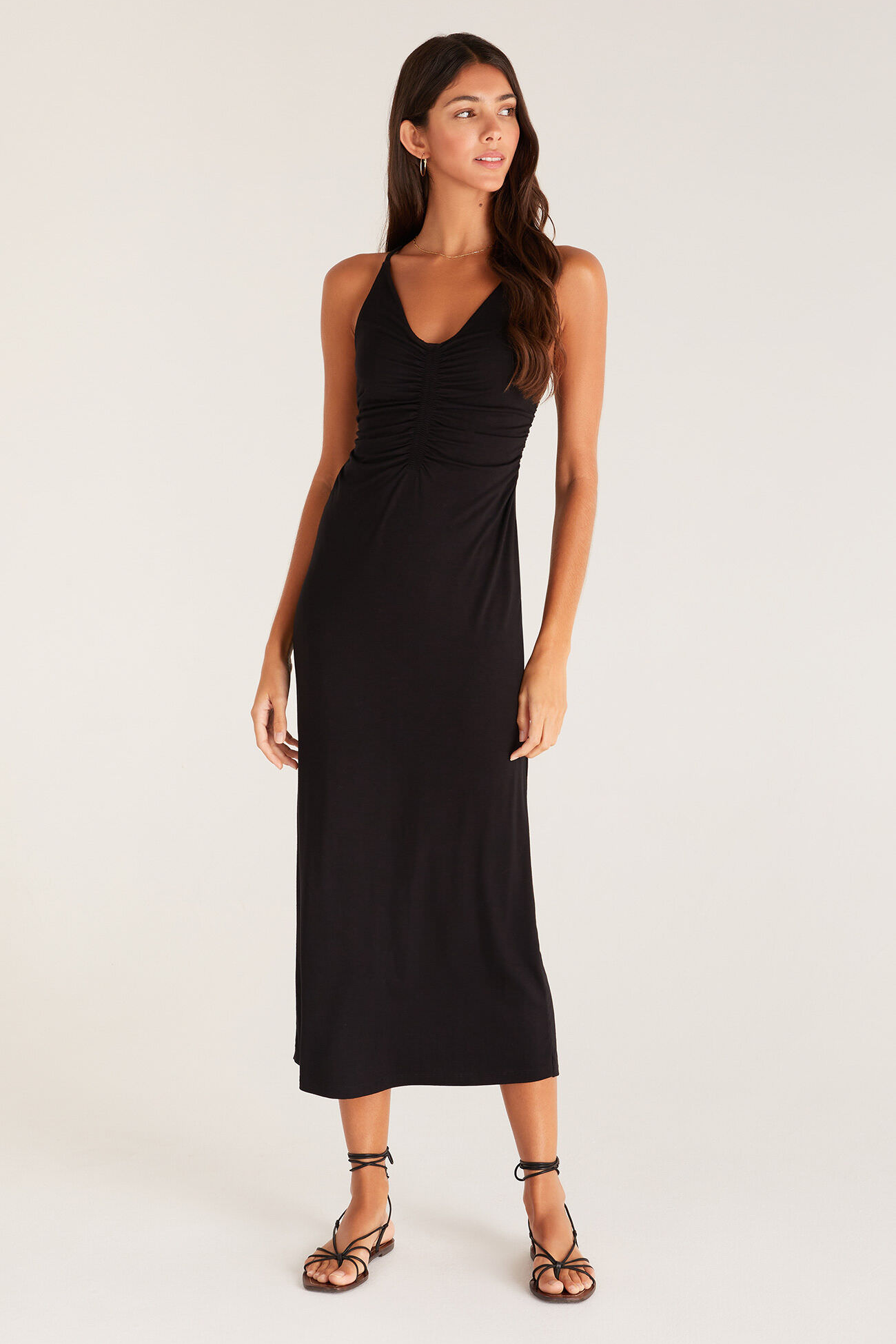 This date night dress is a stunner! The Positano Midi Dress is made using our soft Rayon Spandex fabric that has the right amount of give to hug your curves in all the right places. The bodice is gathered in the middle for a ruching effect, leading to a flattering v-neckline and spaghetti straps that meet in a y-design at the low cut back.