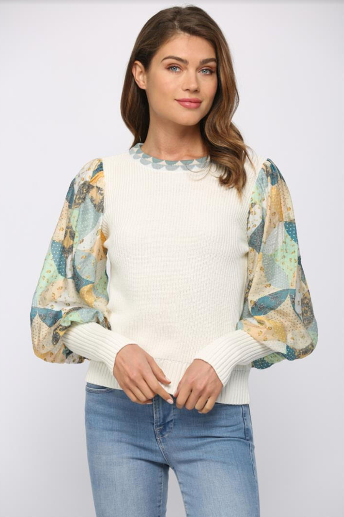 This knit blouse is great for a cooler summer day. Off white knit looks great with the blue floral sleeves. Great with a blue denim.
