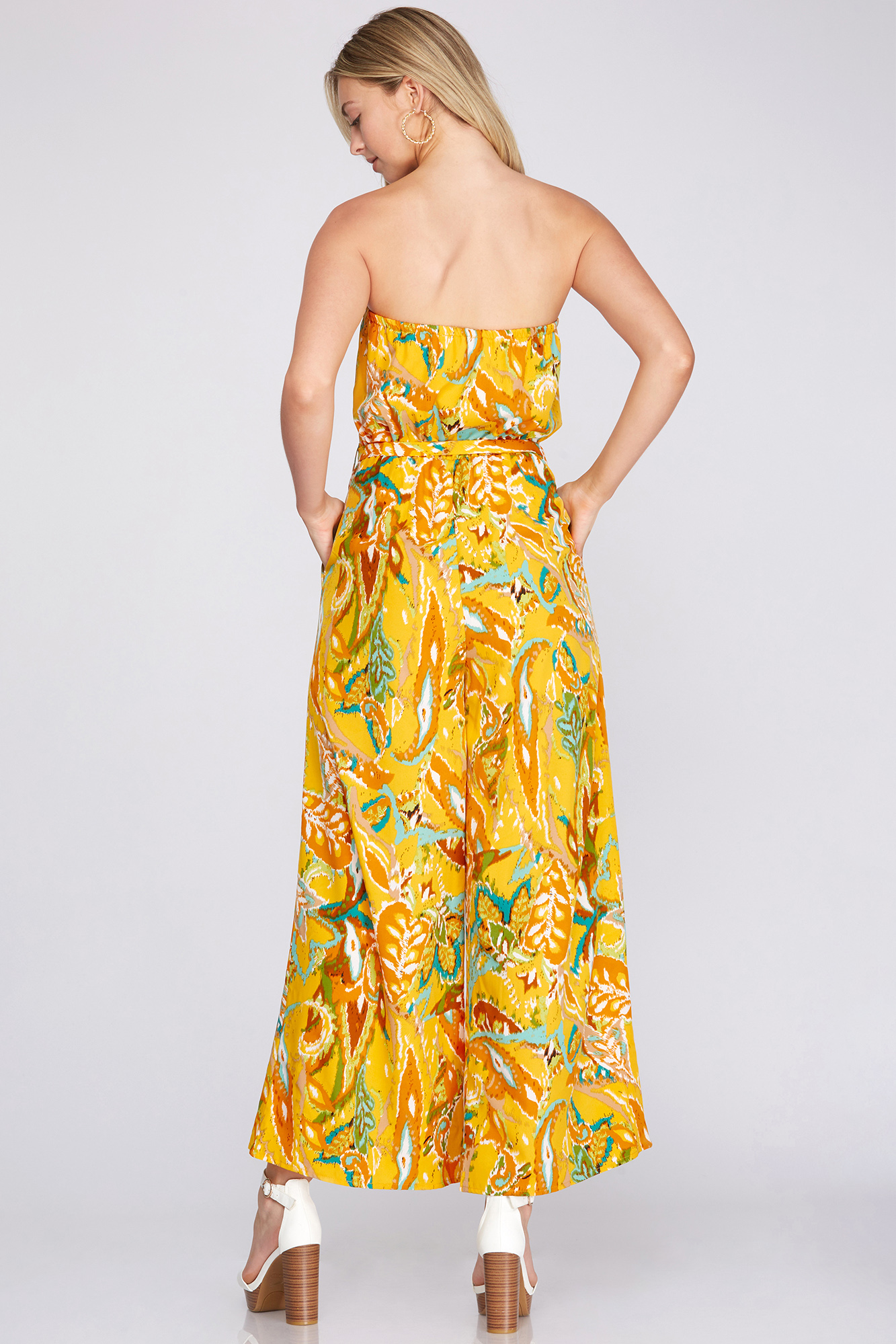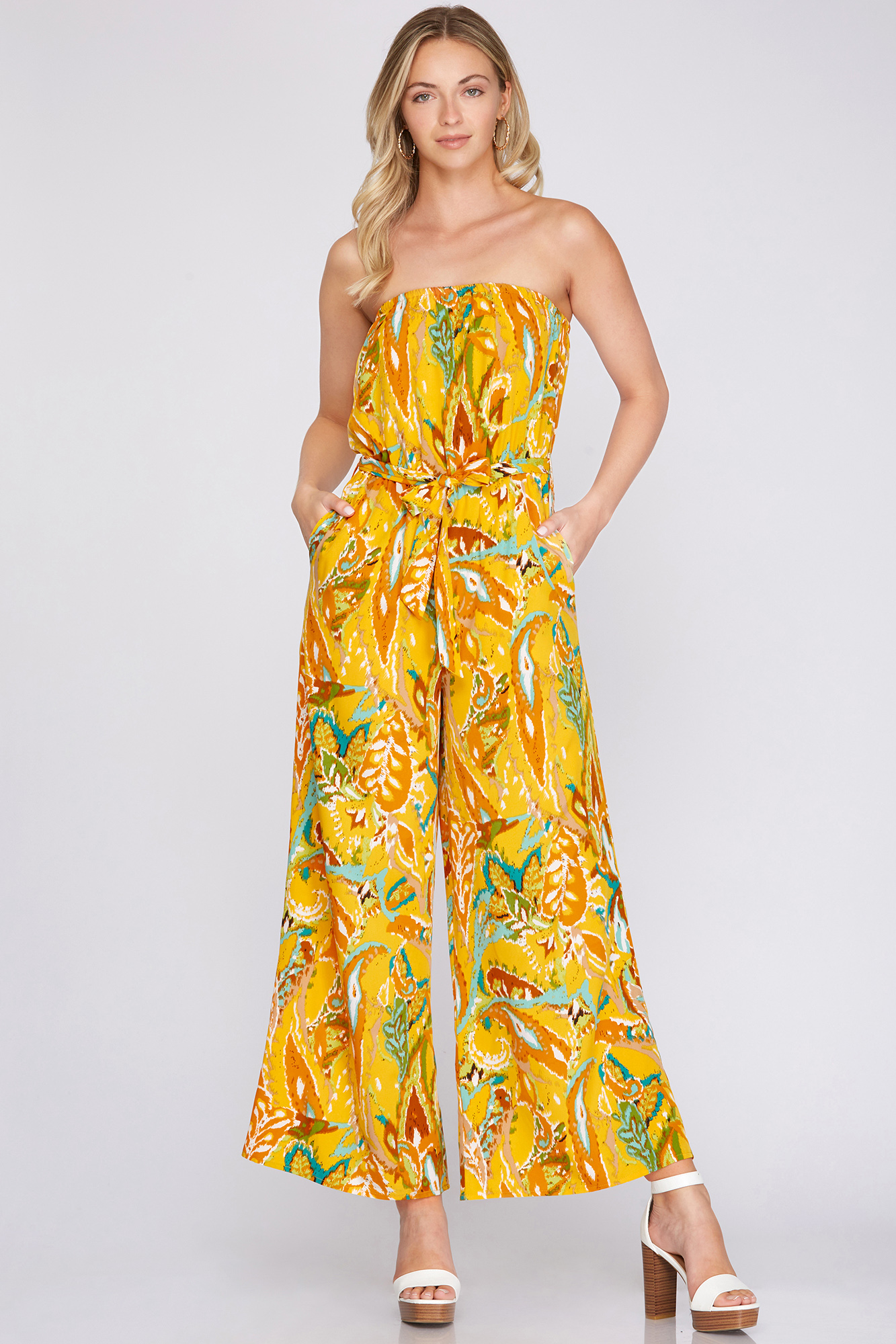 Woven printed strapless jumpsuit with waist sash and pockets. Pair with wedge heels or sandals.
